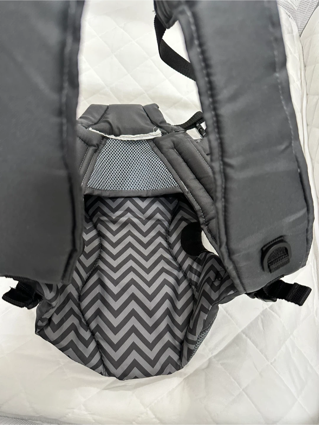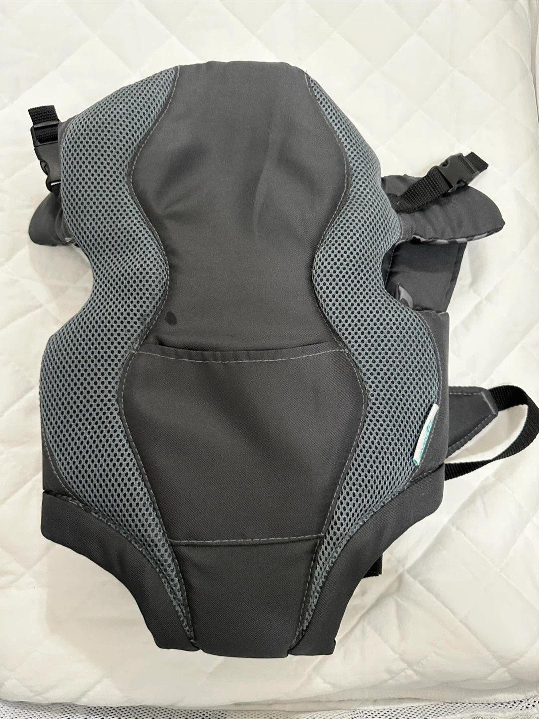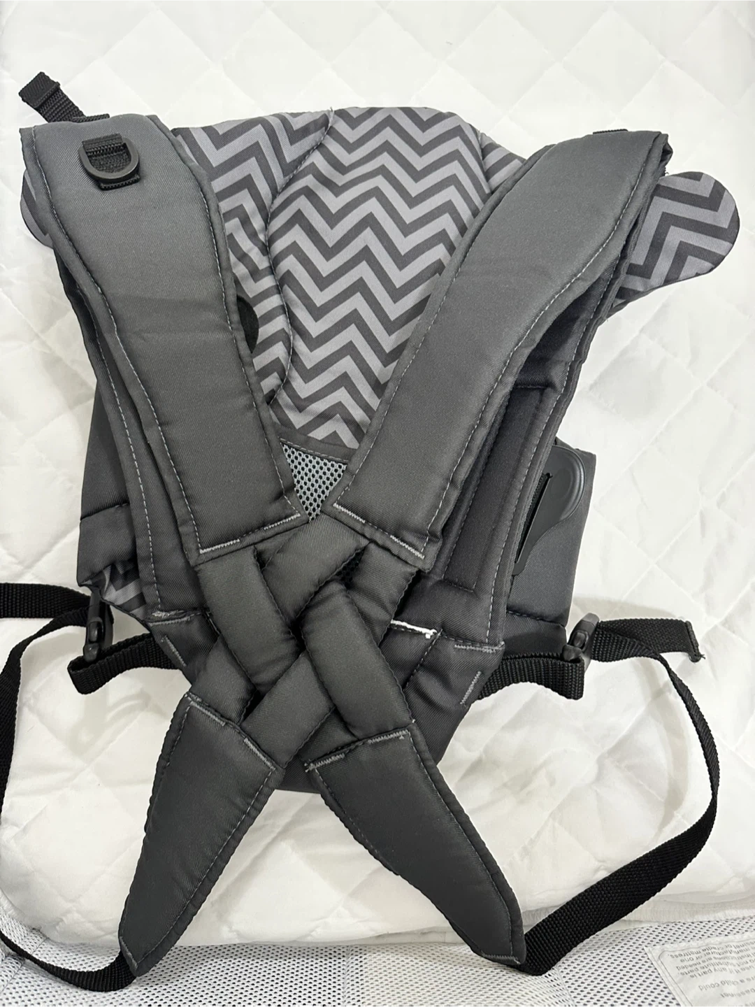 I'm selling my Evenflo breathable baby carrier, which is grey chevron in color. It's been used for just 1 months and is in great condition. This carrier features two carrying positions: facing in for infants and facing out for older babies. It's designed for front-carrying only and provides a cool and comfortable environment for both baby and parent.