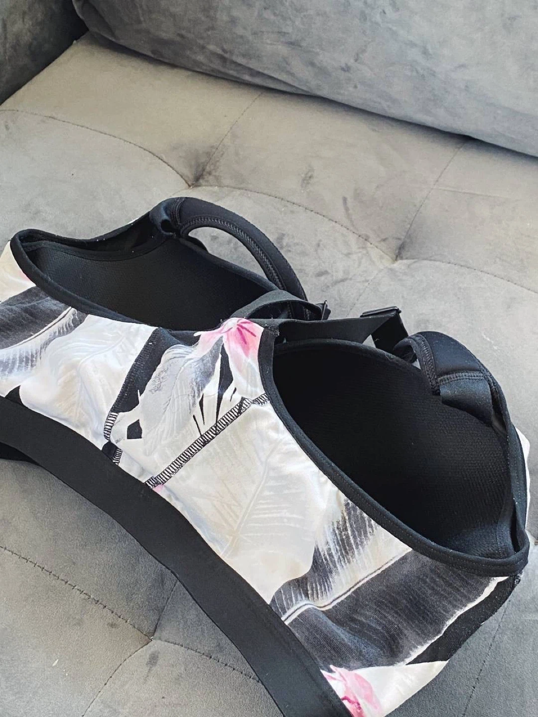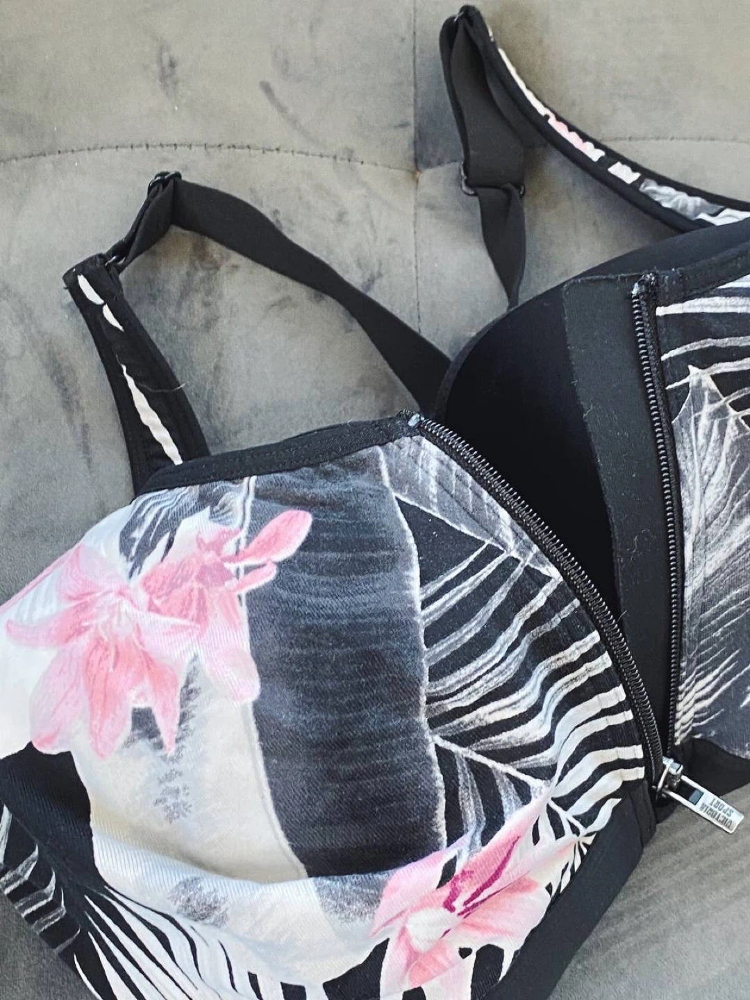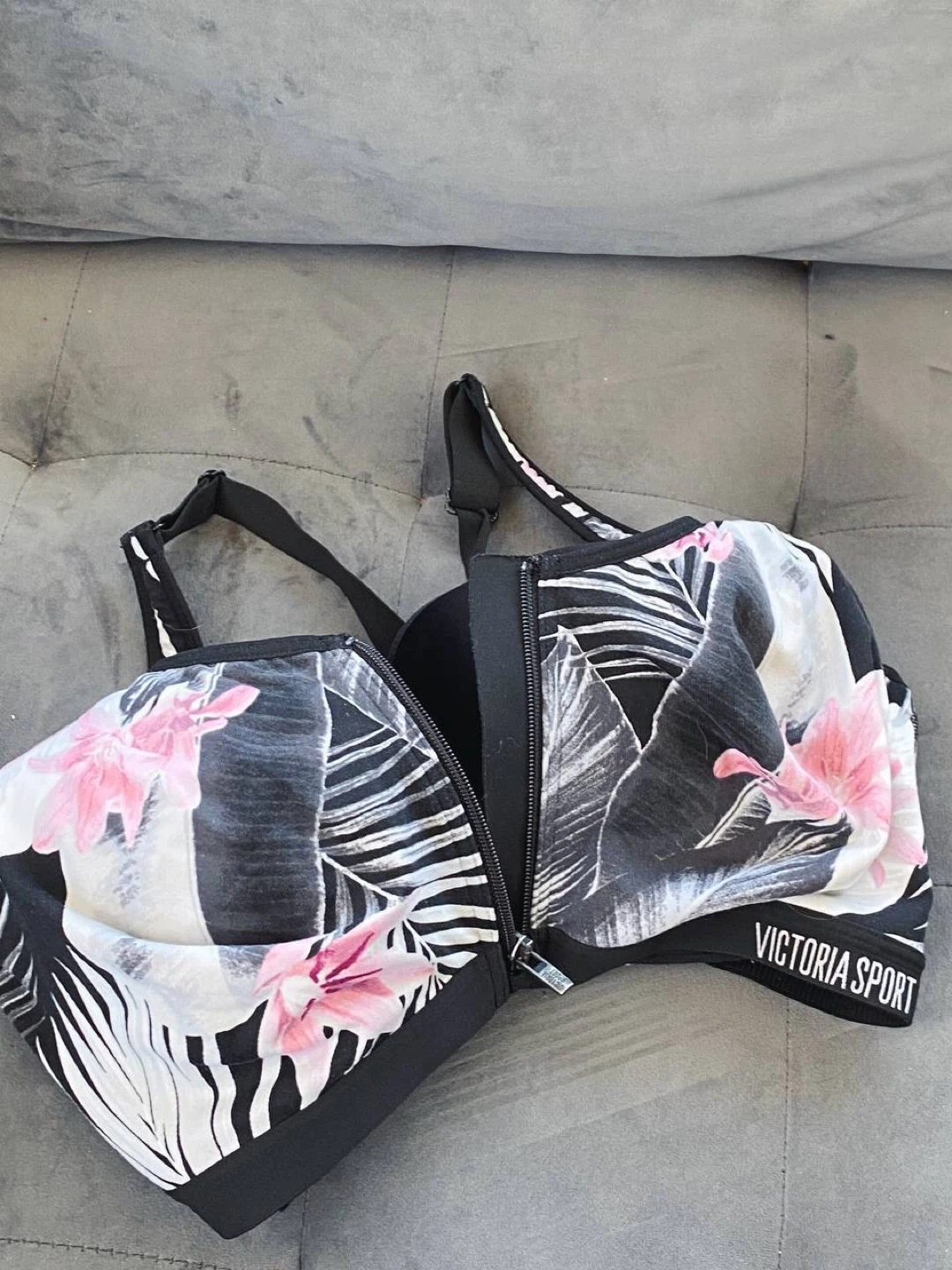 Women's Victoria Sport Knockout sports bra. Size 36DD. Front closure. Black and white tropical print. Excellent support.