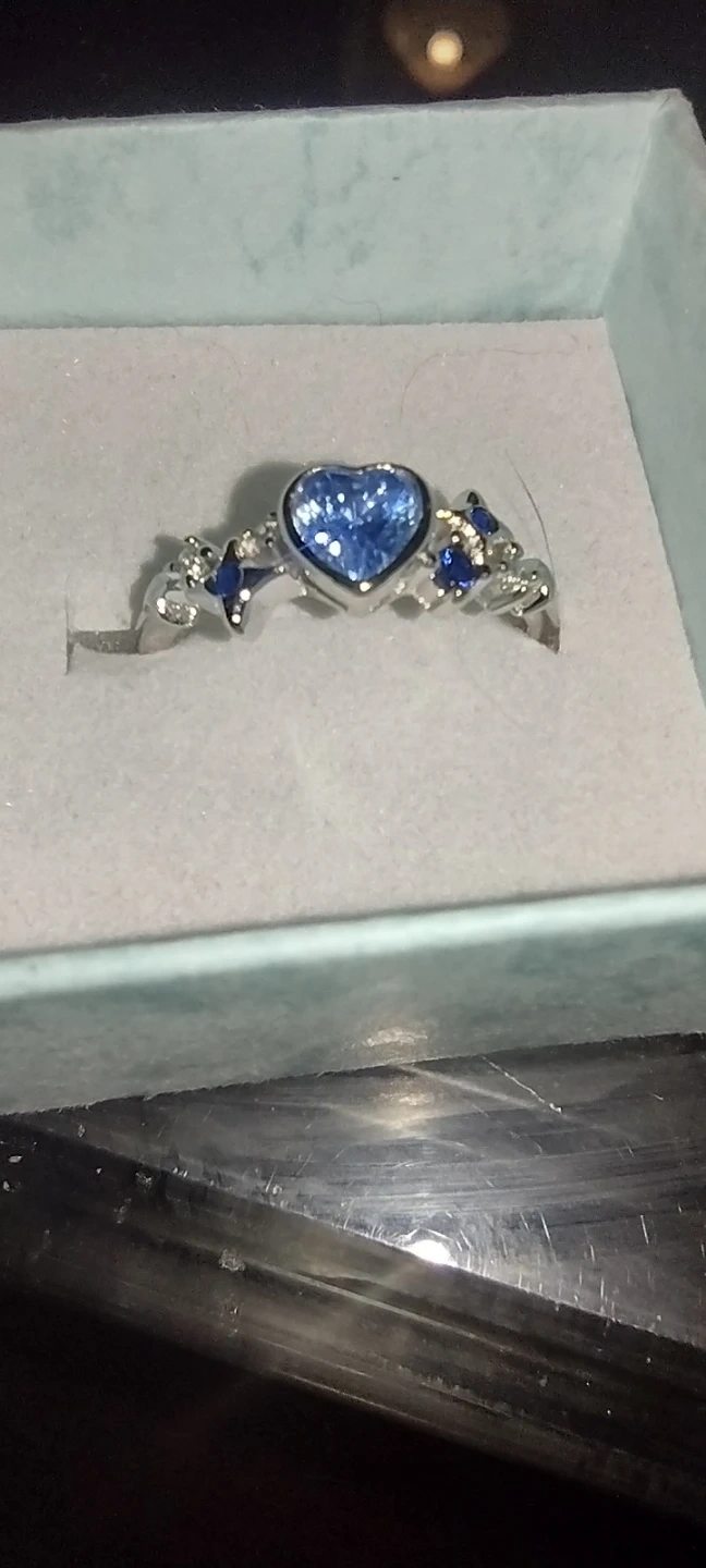Selling a cute Sterling Silver ring with a blue heart-shaped stone! It's in excellent condition and comes in a Gift box.