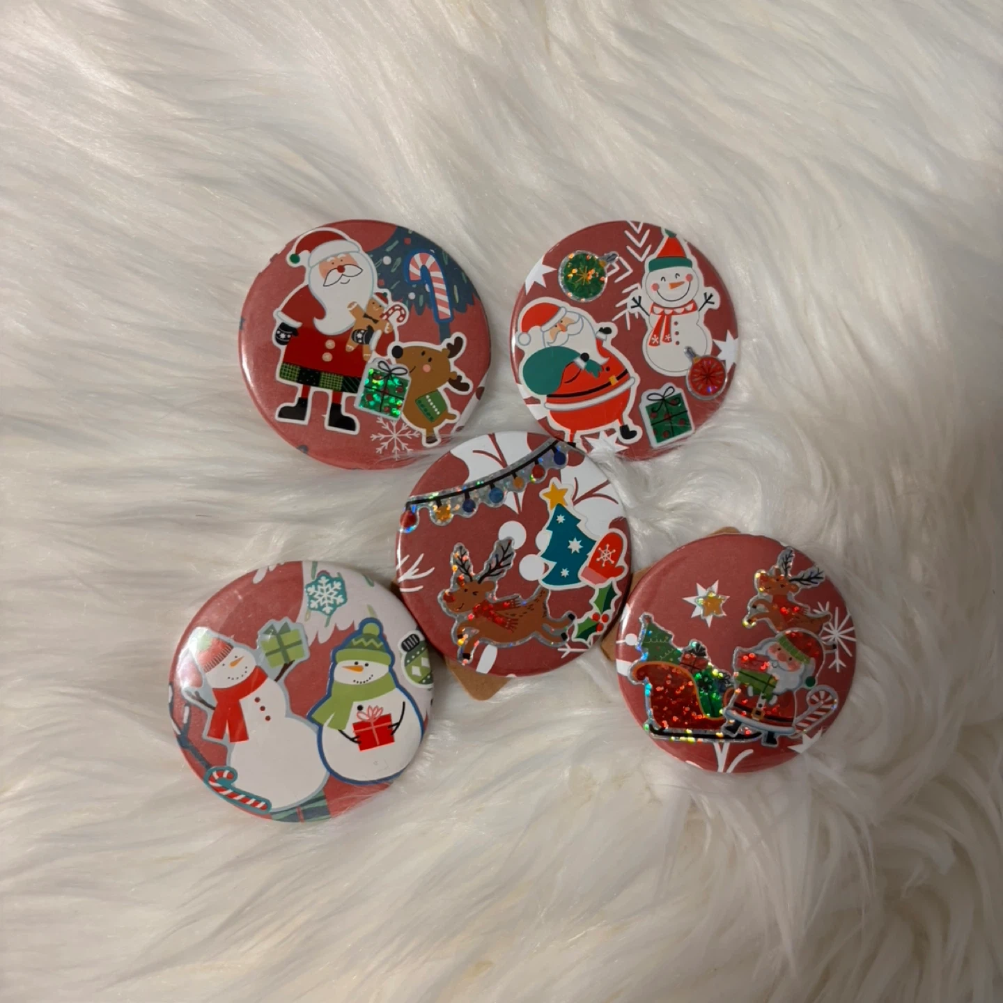 Here's a set of 5 festive Christmas holiday pins! They feature cute designs like Santa, snowmen, and reindeer. Great for adding some holiday cheer to your outfits or bags