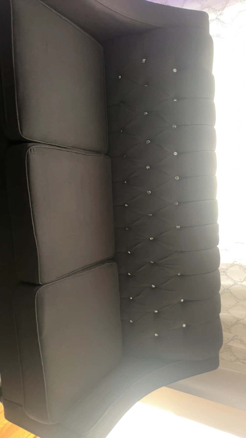 Selling a black sofa couch. It features a tufted design with button accents, giving it a stylish and elegant look. The cushions appear to be in good condition, offering comfortable seating. Perfect for adding a touch of sophistication to your living space