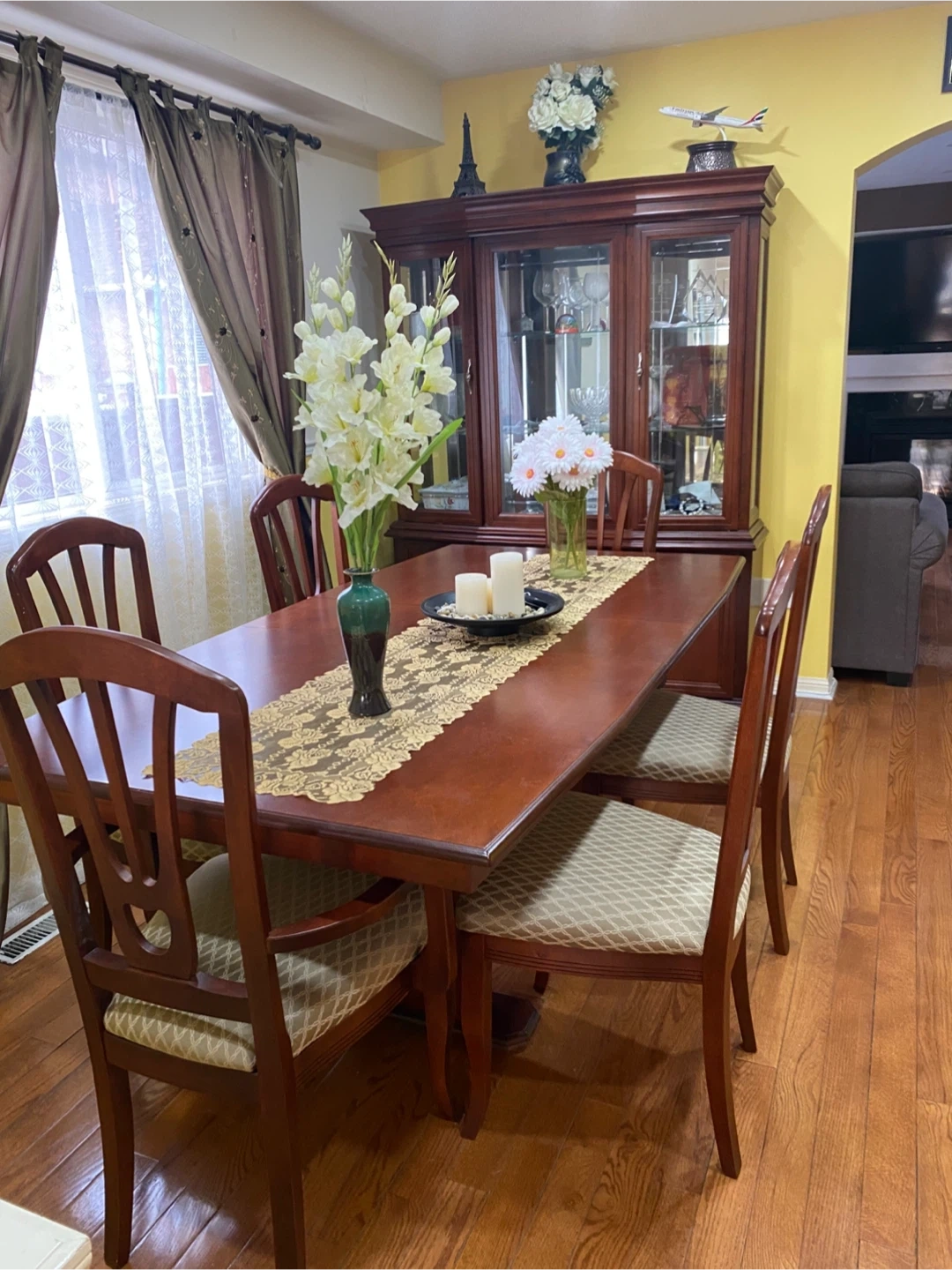Selling a dining table with six chairs & Hutch. The table is a dark wood colour. The chairs have a patterned seat.