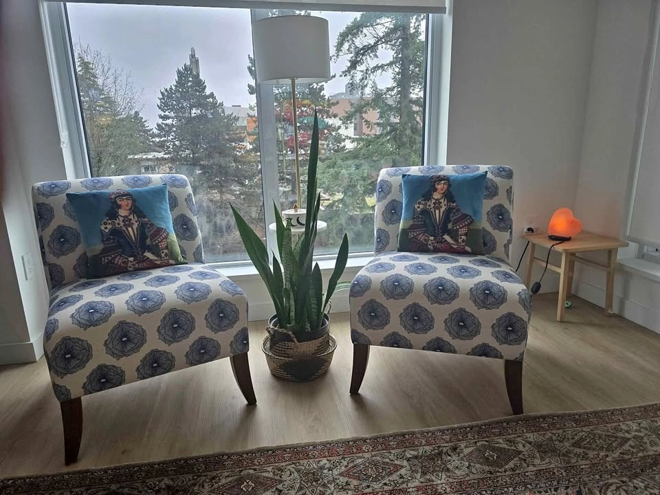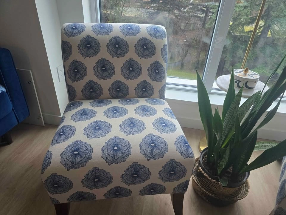 Beautiful set of 2 blue floral accent chairs in excellent condition. Originally purchased for $400. Used very gently — no stains, no pets on furniture, no damage. Fabric is clean and bright, and the chairs are very comfortable.