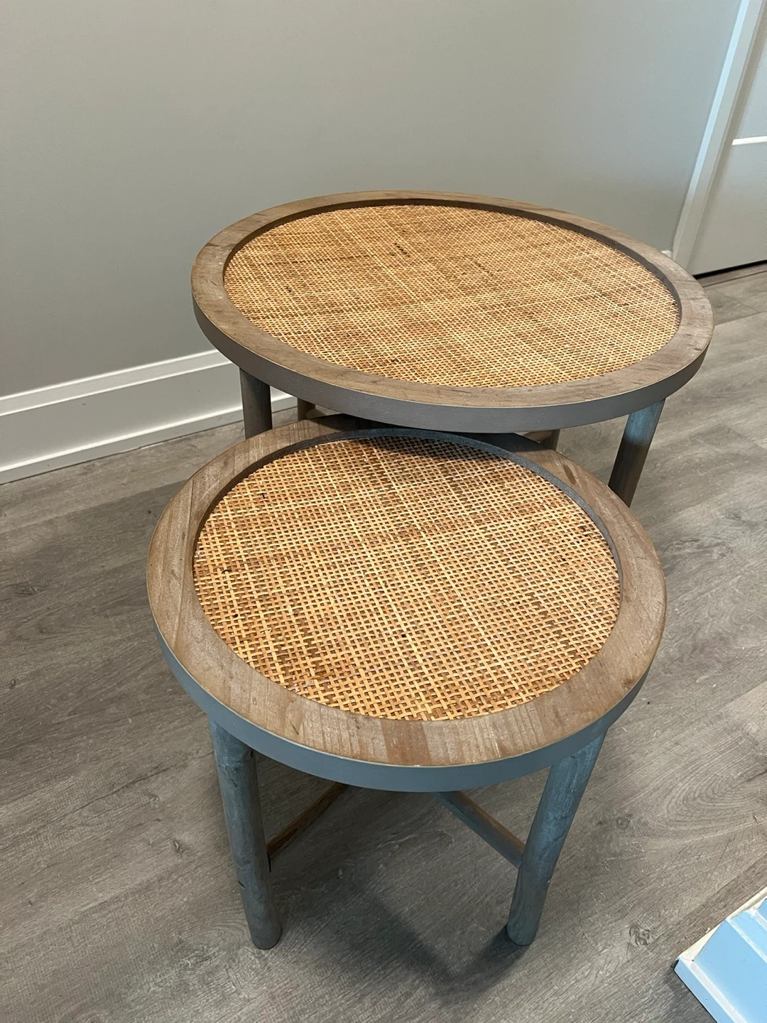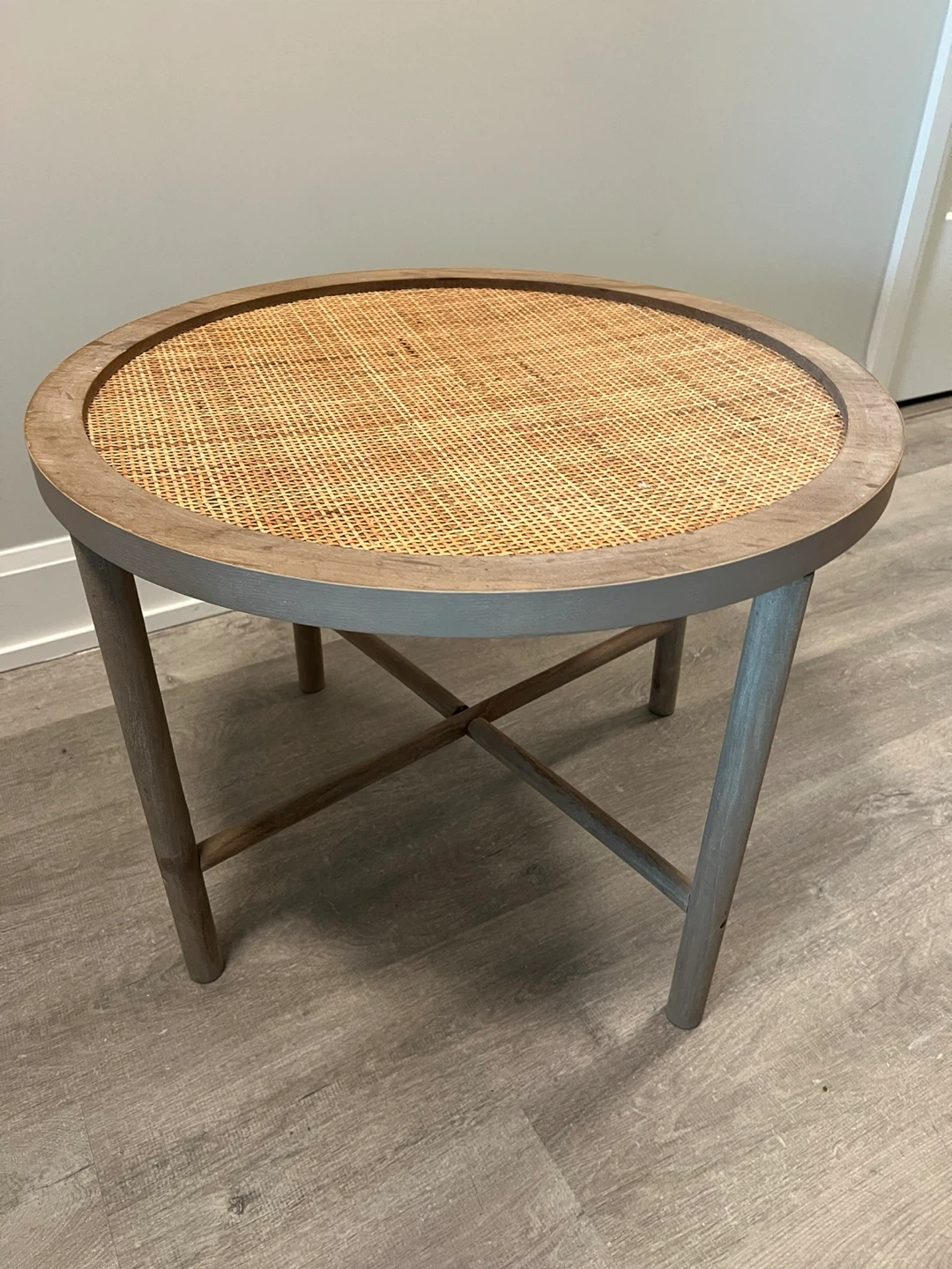 Selling a rustic rattan side table! It features a vintage wood and rattan design that adds warmth and aesthetic to your home decor. The table is made of high-quality wood and natural hand-woven rattan, with a smooth wood grain and natural touch.