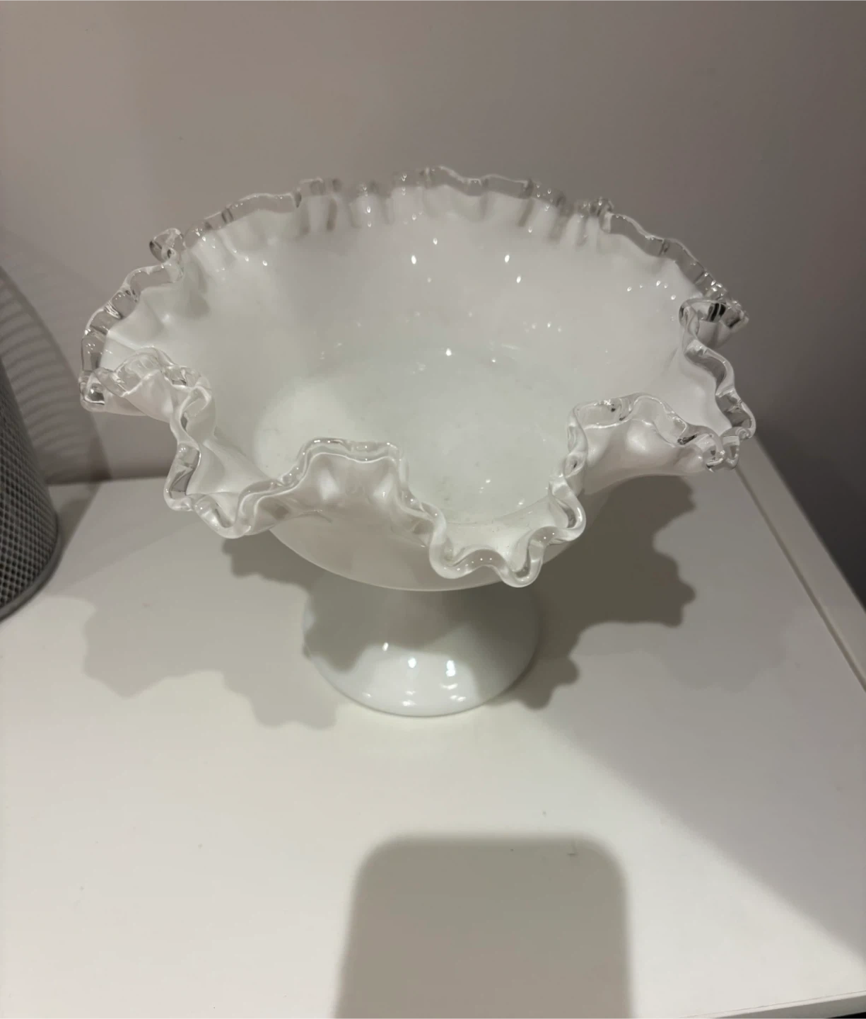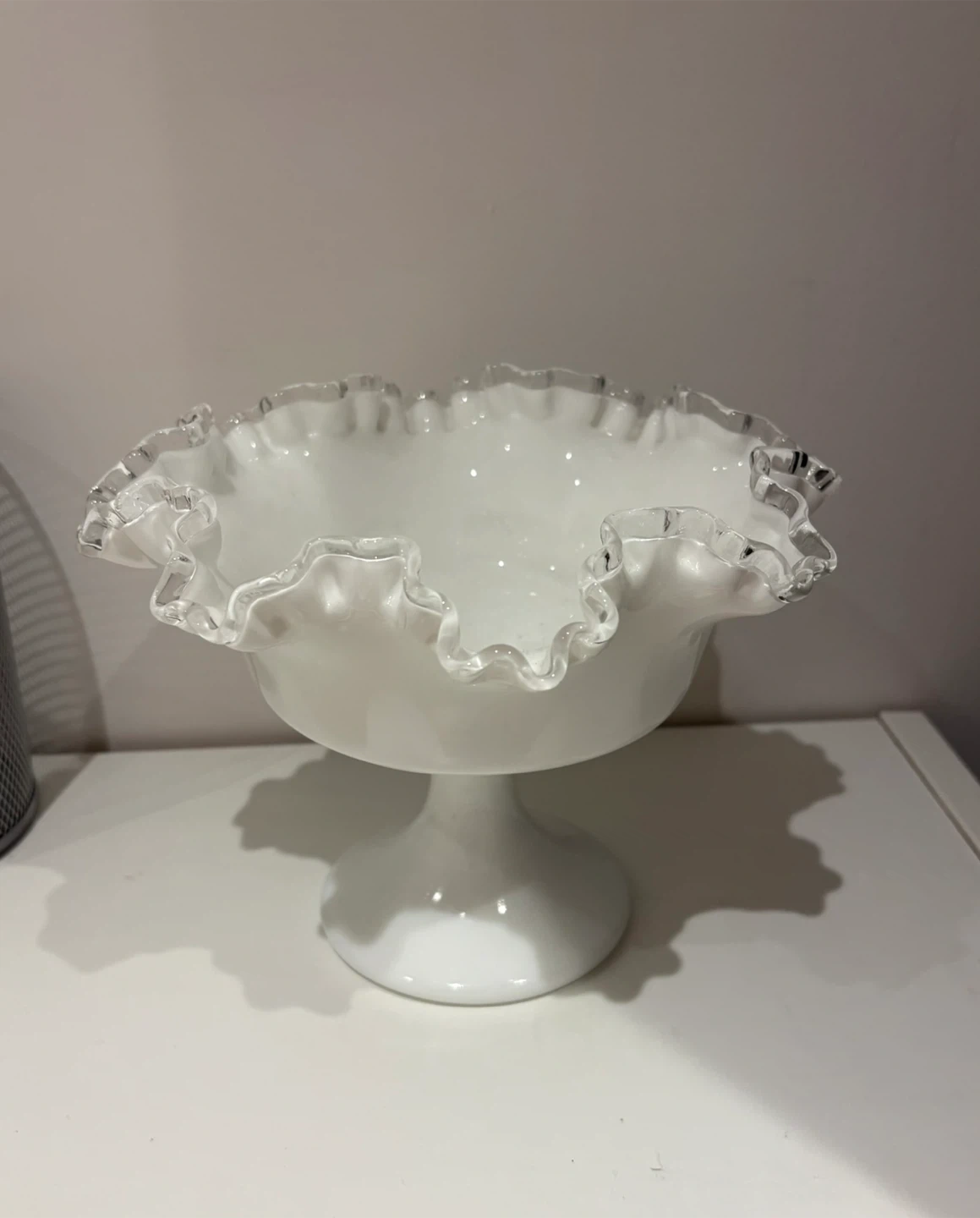 Keywords: Fenton milk glass, silver crest Fenton, Fenton pedestal bowl, vintage milk glass compote, Fenton glass dish, ruffled edge milk glass, mid century glassware, vintage Fenton collectible