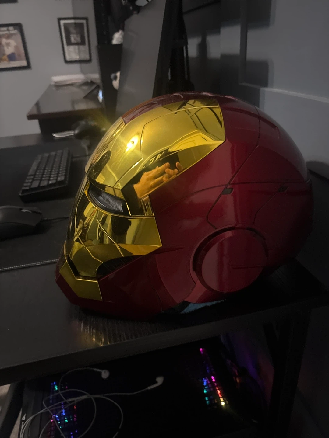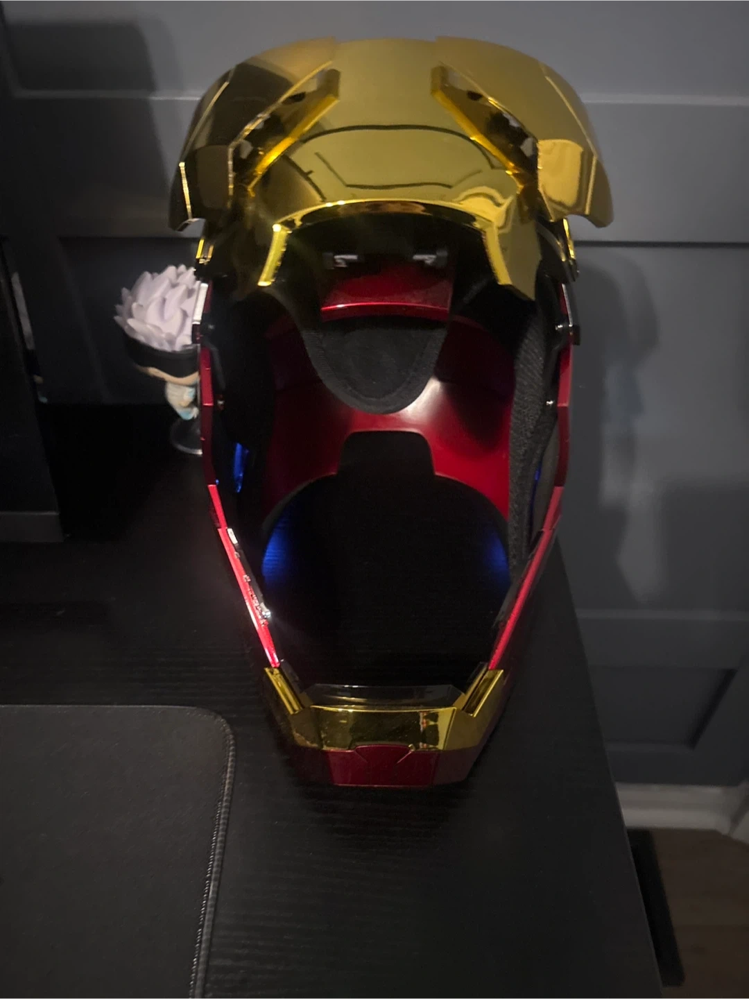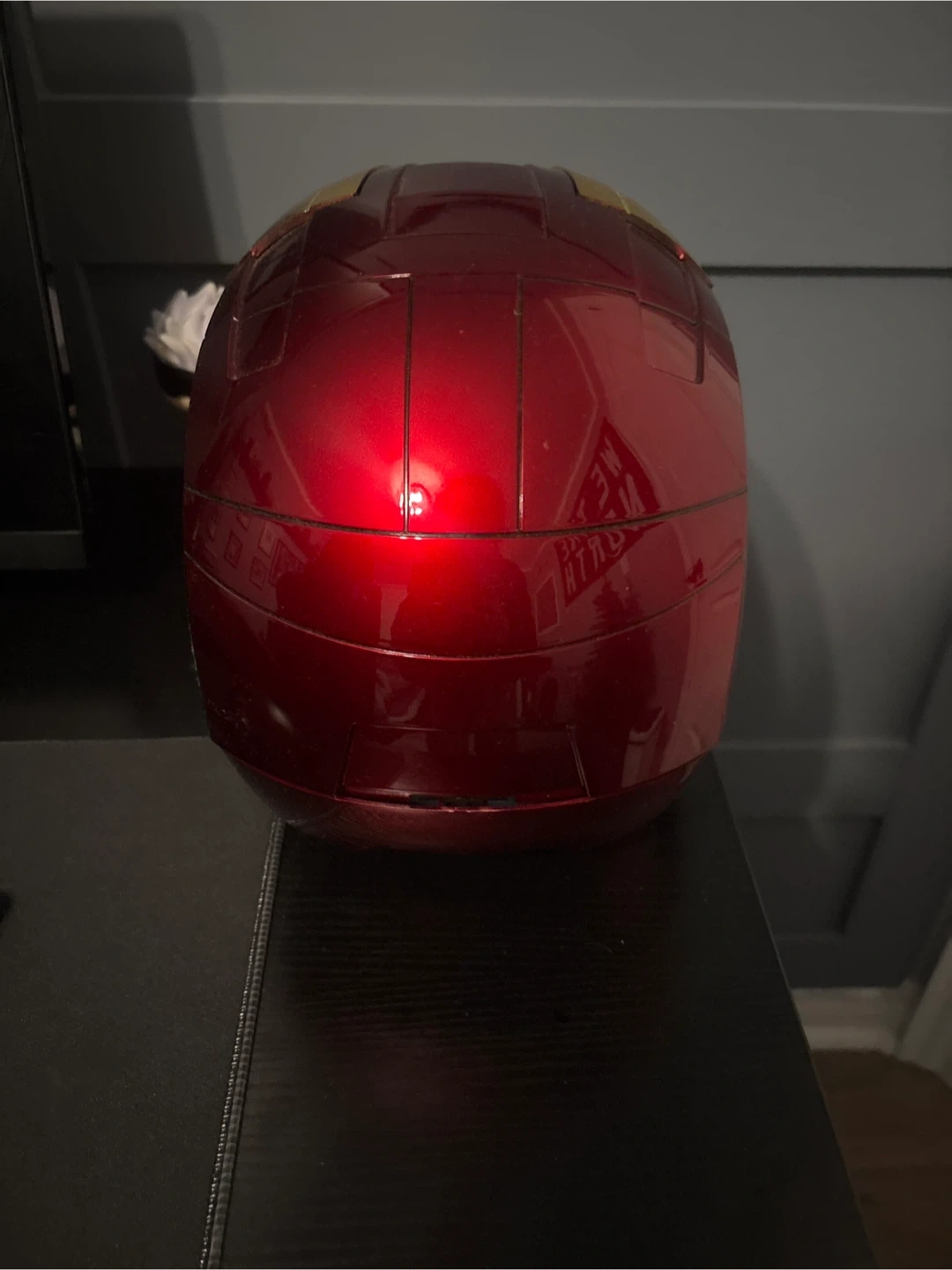 Selling an Iron Man helmet. It's red and gold and in great condition! Also included is a small device that controls the helmet. It also have voice command.