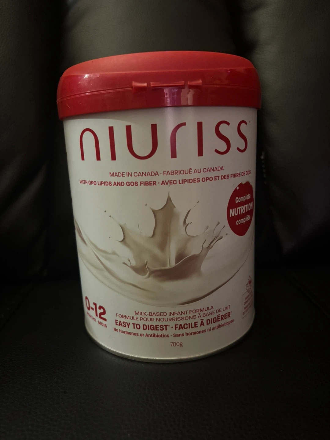 Free! A can of Niuriss infant formula, perfect for little ones aged 0-12 months! It's made in Canada and contains OPO lipids and GOS fiber for complete nutrition. The can is 700g and the expiration date is in 2026