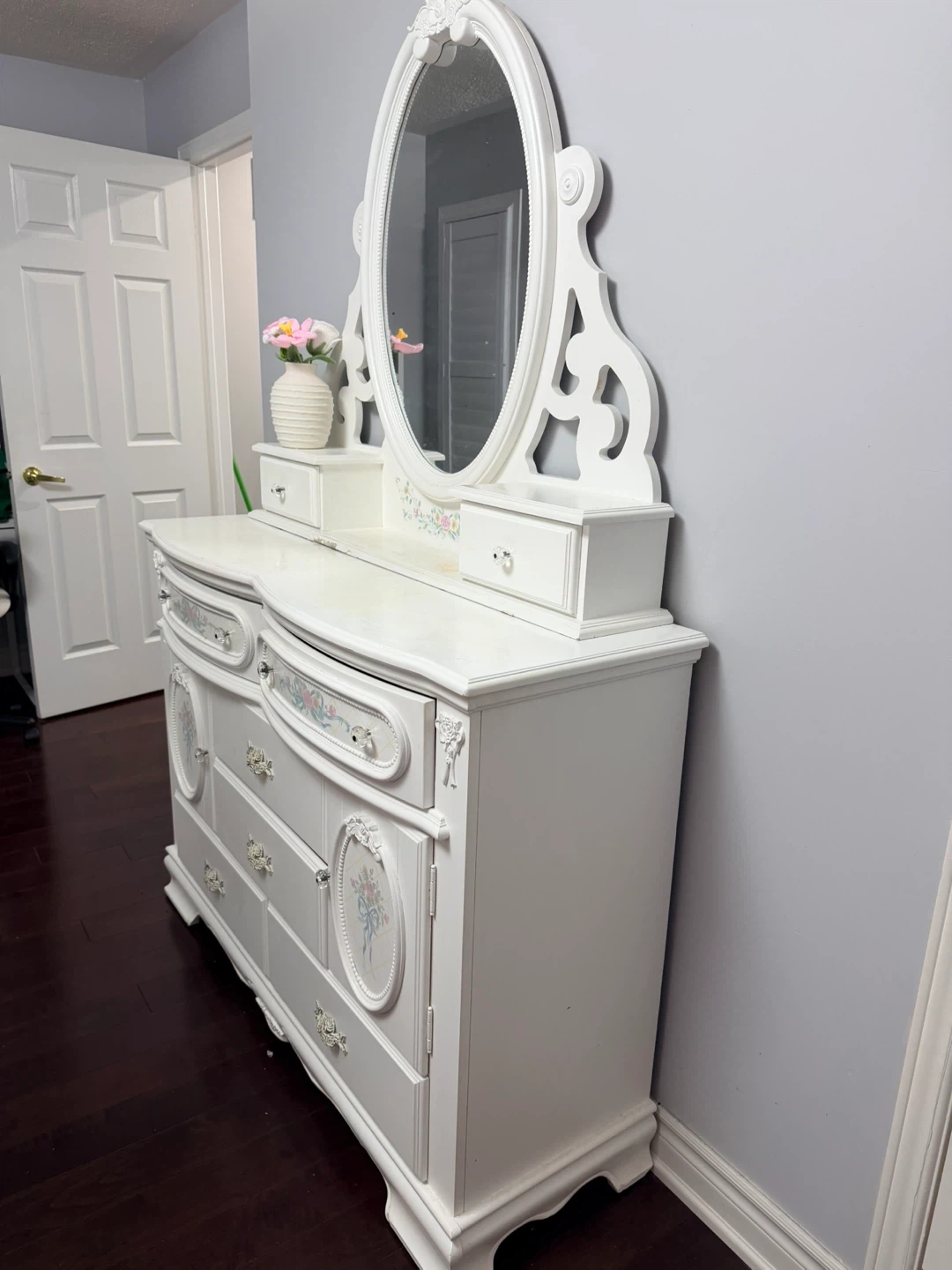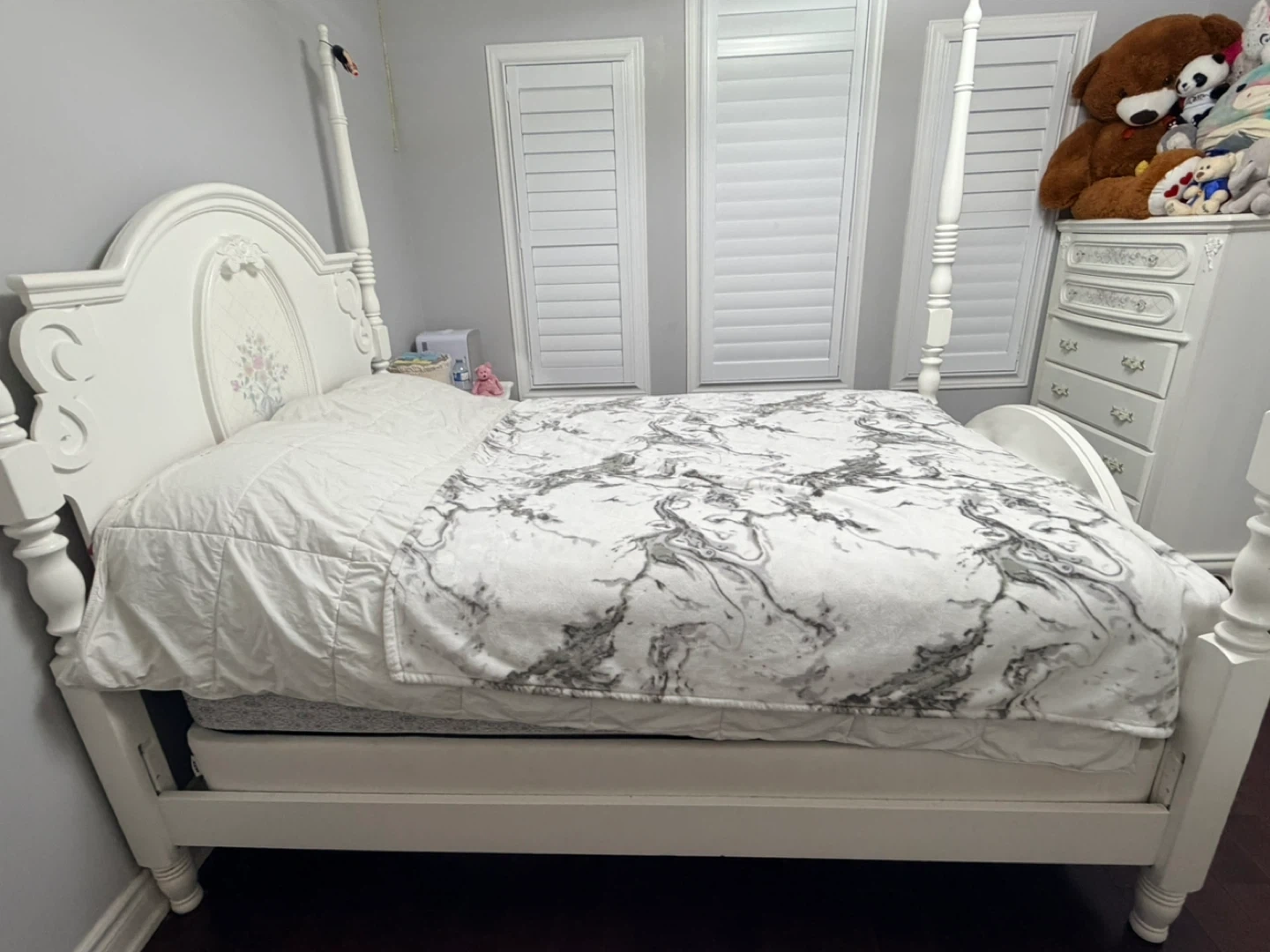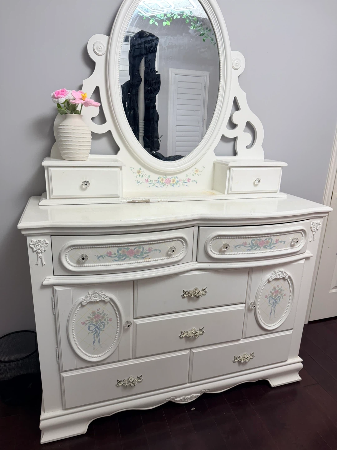 Selling a lovely white vanity with a mirror and a matching bed set. Both pieces are in great condition and would be perfect for a bedroom makeover! Vanity is in good condition and the rest of the pieces are like new condition‼️PRICE NEGOTIABLE❗️Don’t miss out on this amazing listing! Reminder: Doesn’t come with mattress only bed frame!!