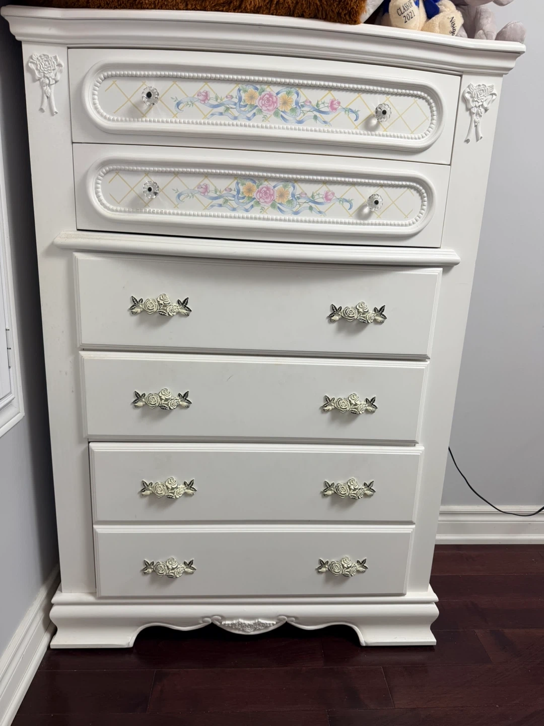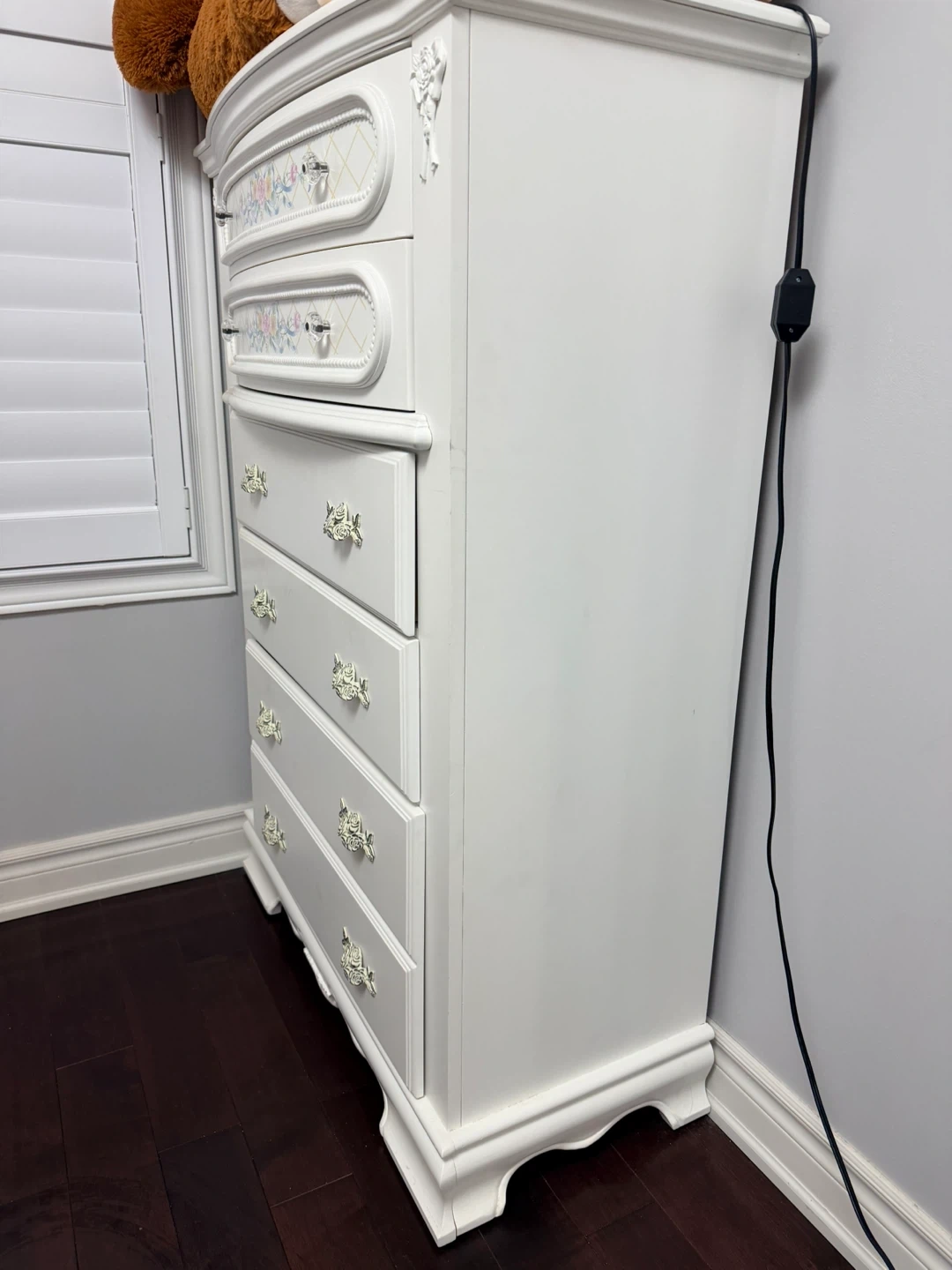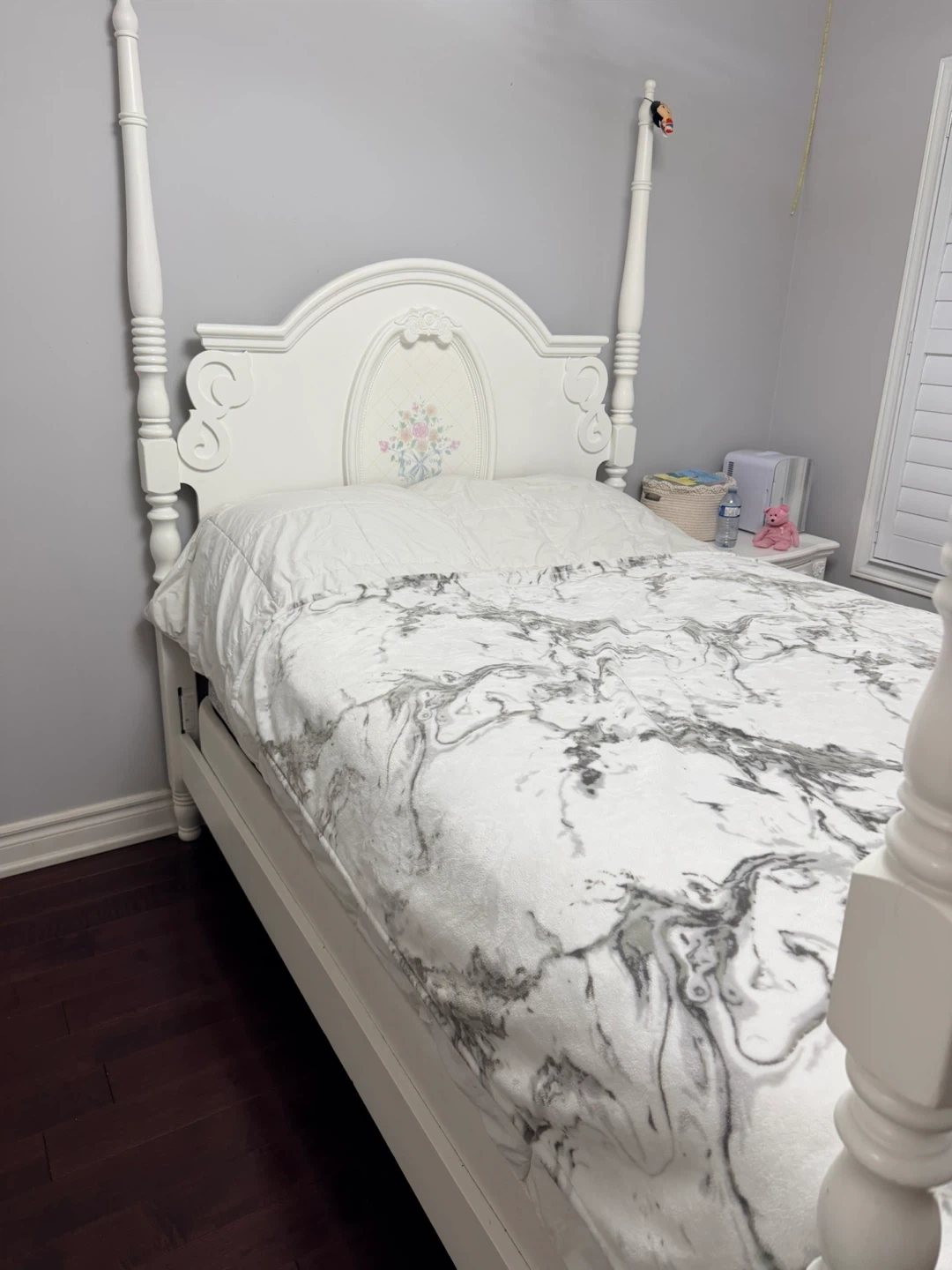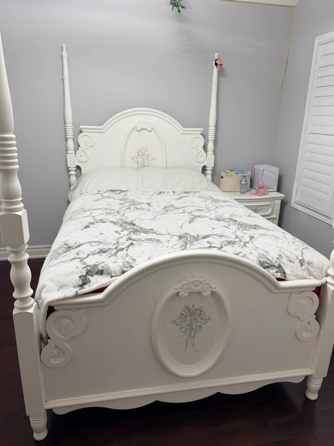 Selling a lovely white vanity with a mirror and a matching bed set. Both pieces are in great condition and would be perfect for a bedroom makeover! Vanity is in good condition and the rest of the pieces are like new condition‼️PRICE NEGOTIABLE❗️Don’t miss out on this amazing listing! Reminder: Doesn’t come with mattress only bed frame!!