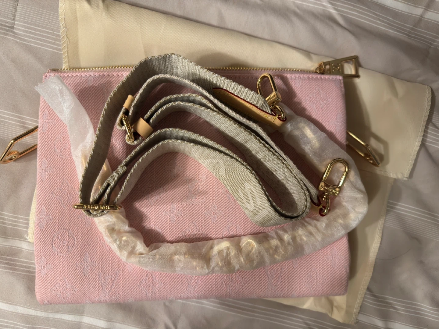 Selling a brand new Louis Vuitton By The Pool pouch in pink jacquard. This stylish pouch is perfect for keeping your essentials organized. It comes with its original dust bag and strap with gold chain. The pouch features a double zip for easy access and a beautiful pink jacquard pattern that's sure to turn heads!