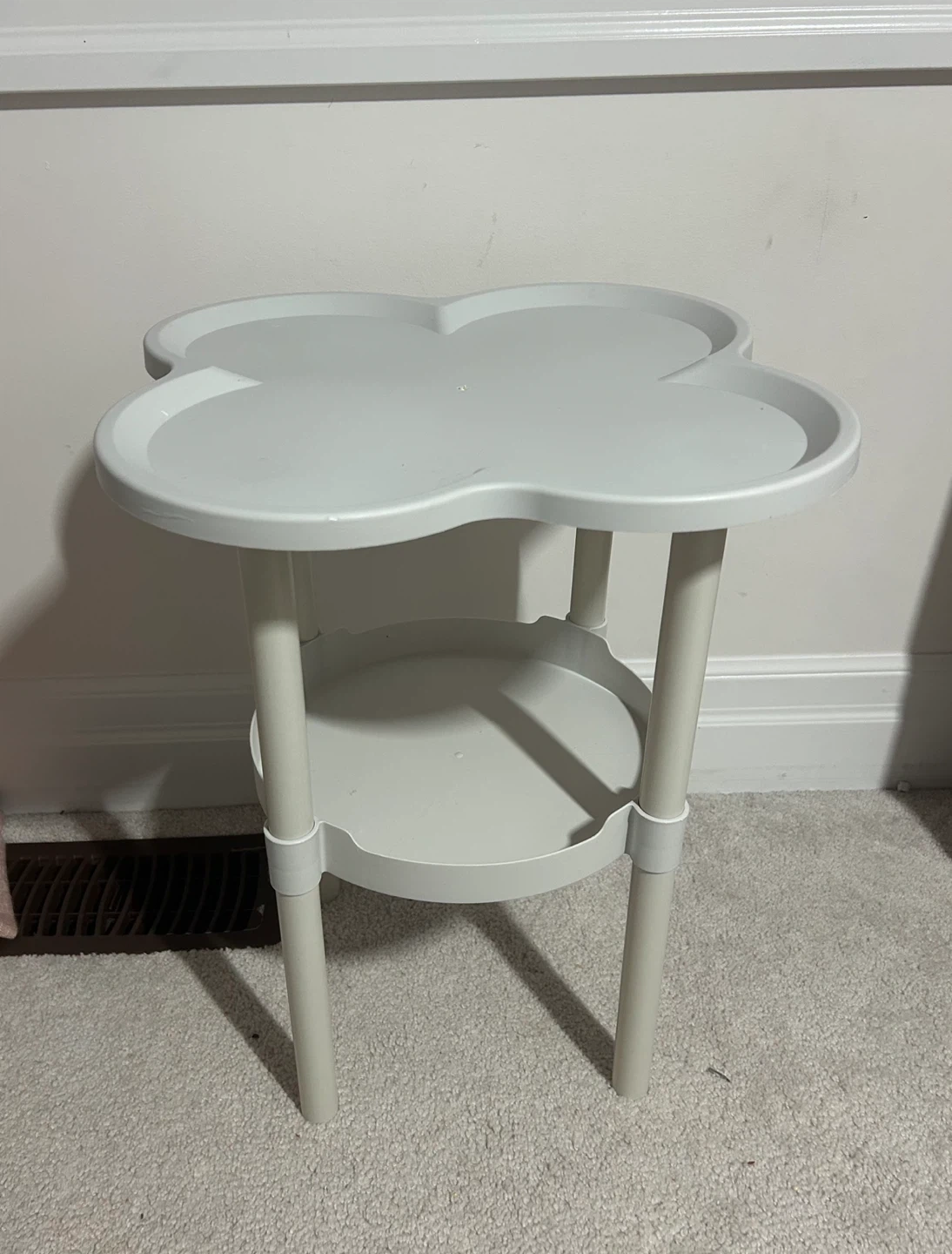 Cute plastic little side table with a clover-shaped top and a second tier for extra storage! It's in great condition and would be perfect for a small space. Perfect condition
