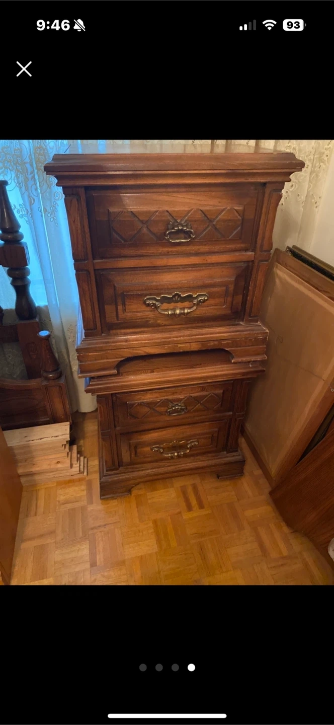 Selling a vintage wooden bedroom set. It includes a dresser with mirror , Two nightstand, one chest and a bed frame. The set has a classic design and is in good condition.