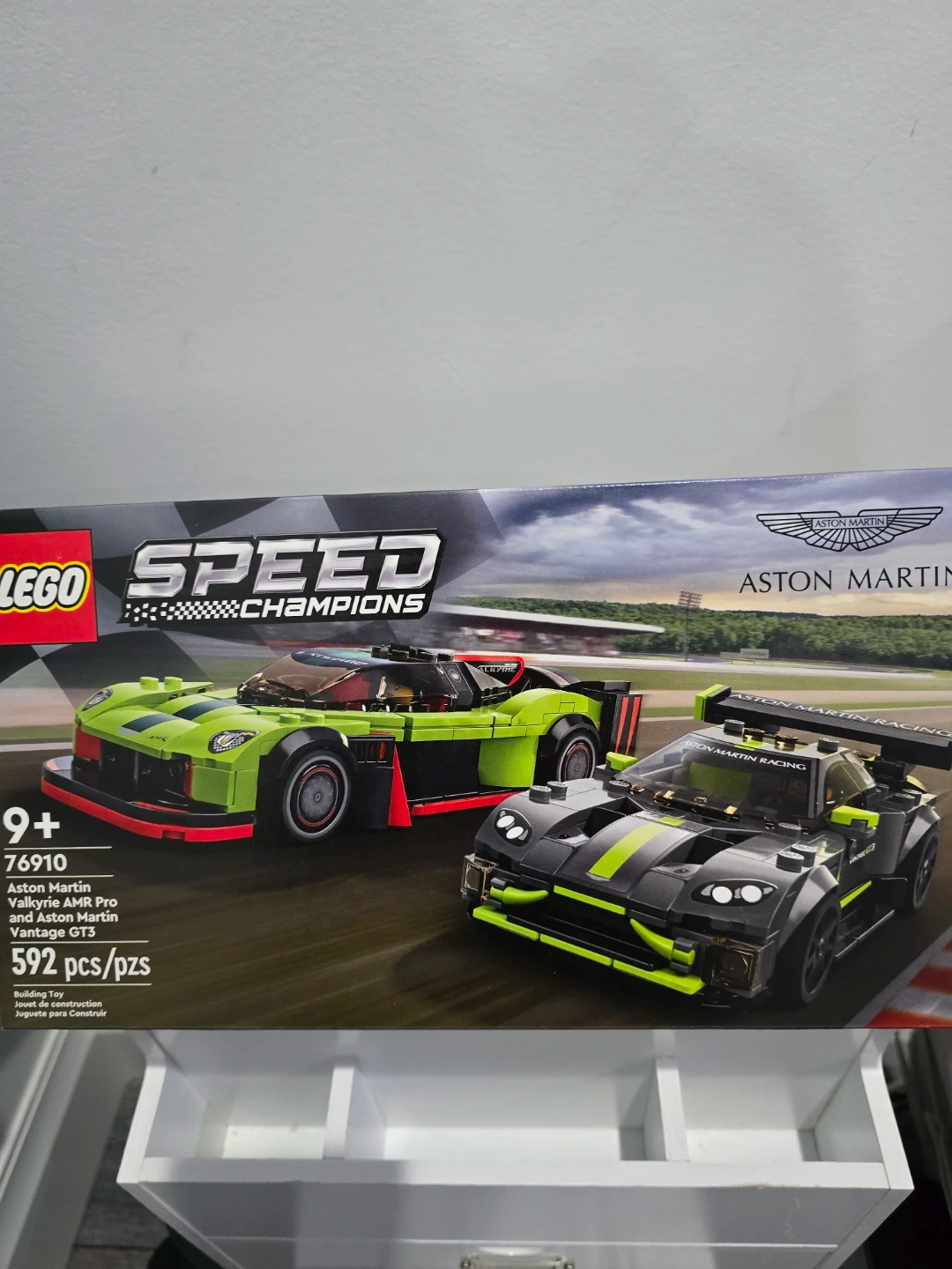 Selling a LEGO Speed Champions set featuring the Aston Martin Valkyrie AMR Pro and Aston Martin Vantage GT3. This set is for ages 9+. It contains 592 pieces to build both cars. Great for any LEGO or car enthusiast!
