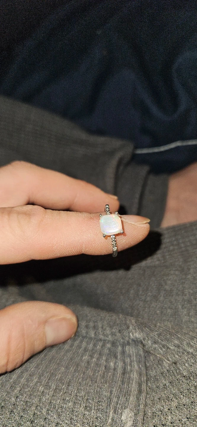 The ring also %92.5 Silver and contains a brilliant white (Wollo) Opal with flashes of orange/red/green/blue, and it is eye catching.