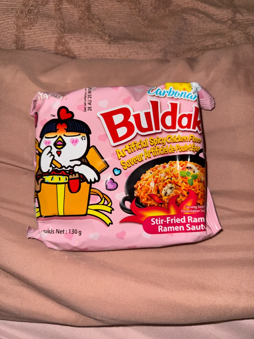 Giving away a pack of Buldak Carbonara Artificial Spicy Chicken Flavor Stir-Fried Ramen Saut! It's brand new and ready to be cooked up. This ramen is known for its spicy and flavourful kick. Net weight: 130g. Expiry Date: 2025 August 26