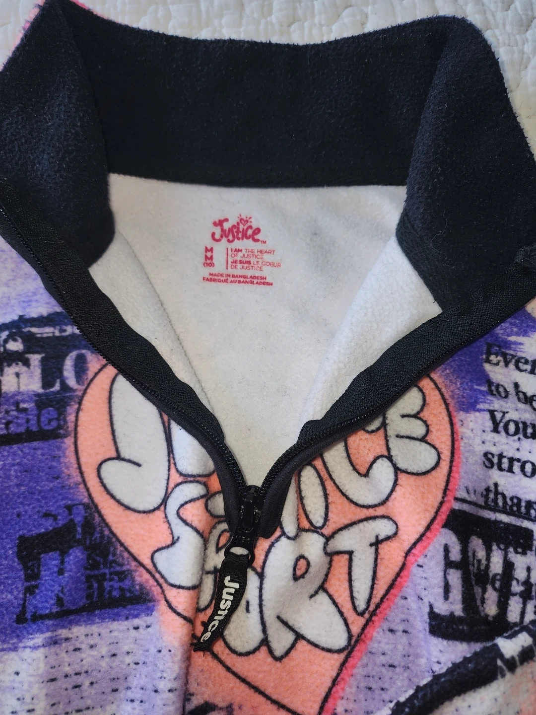 This is cute quater zip is a Justice brand for girls, size medium. It features a fun, colourful design with hearts and newspaper print & inspirational message. " Everything you want to be, you already are. You are more powerful and beautiful than you know"🥰 Pickup or I can deliver for a fee.