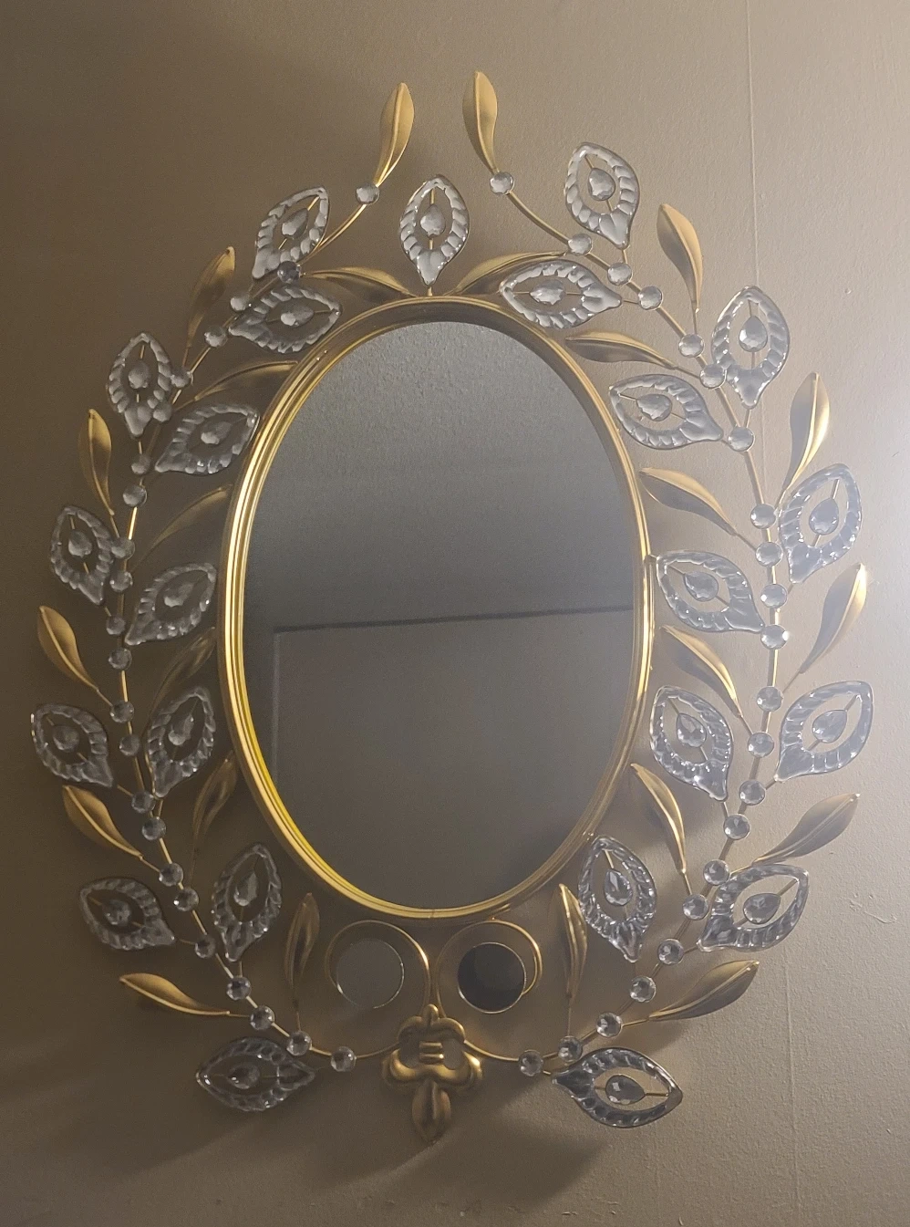 Selling a gold oval mirror featuring a leaf and crystal design. It's a beautiful piece that would add a touch of elegance to any room!
