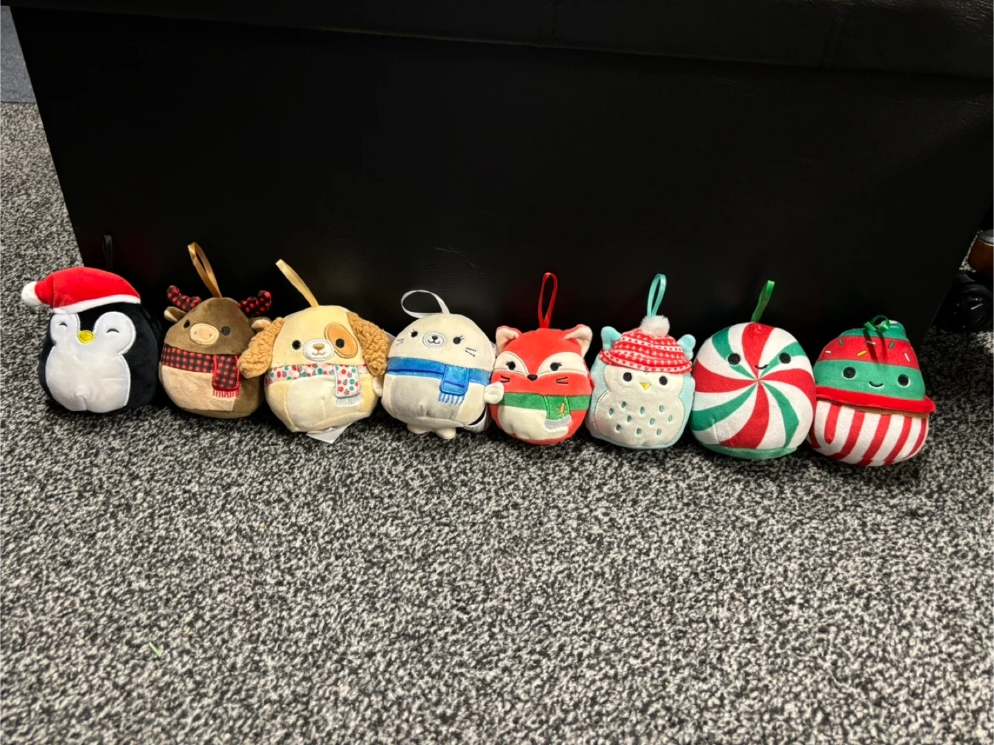 Selling a set of adorable Squishmallows holiday ornament plushies! They're in great condition and ready to add some cuteness to your tree or collection. Includes a penguin, reindeer, dog, seal, fox, owl, peppermint, and cupcake ornament