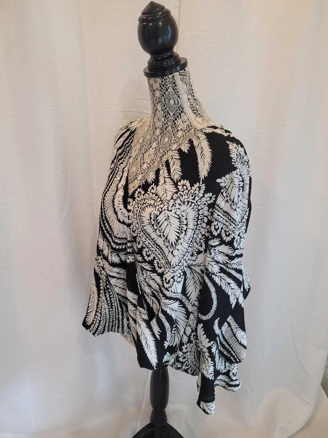 Here's a lovely blouse from INC International Concepts! It features a striking black and white print and stylish ruffle sleeves. Perfect for adding a touch of elegance to your wardrobe