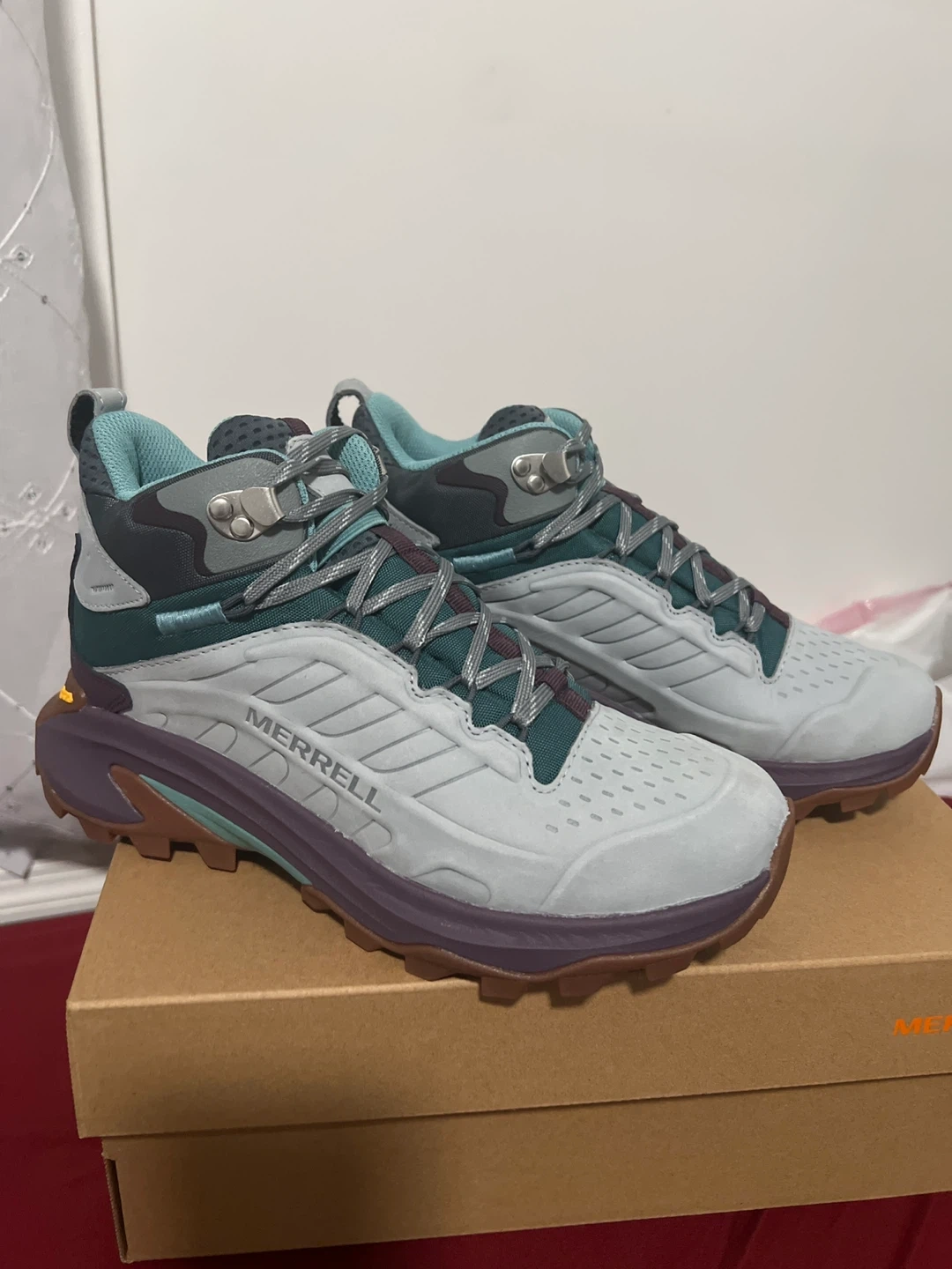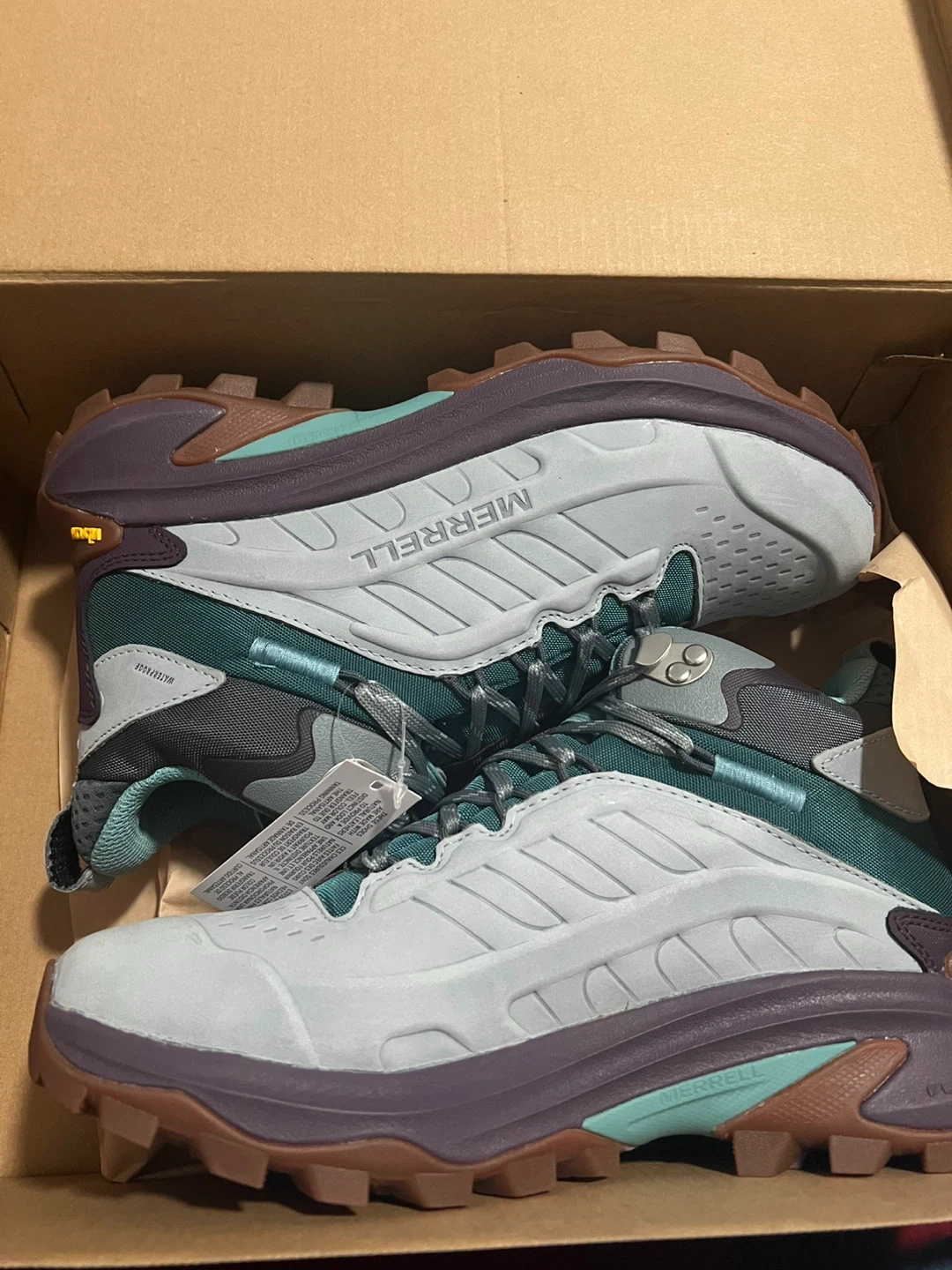 Selling a pair of Merrell Moab Speed 2 LTR Mid WP hiking shoes for women! They are a size 8 US. The color is Gris Moyen (gray). Comes with the original box!