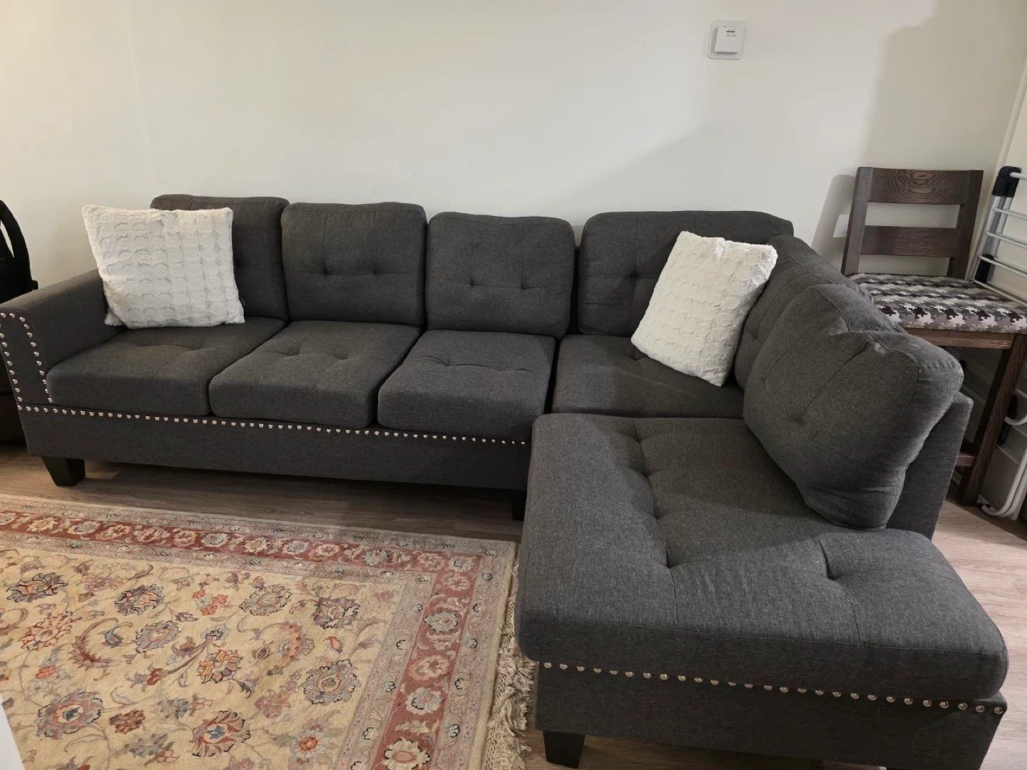 Selling a like-new grey sectional sofa. It's in great condition and would be a comfy addition to any living room! The dark grey colour is neutral and goes with everything its from wayfair and I bought it for 800$ last year so it is pretty new