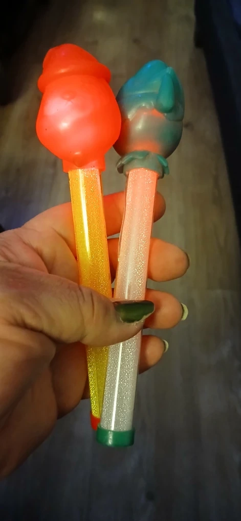 2 light up Christmas toys 1 is Santa Claus and the other is an Elf. They both have glittery stems and are in good condition for their age bang them and they light up