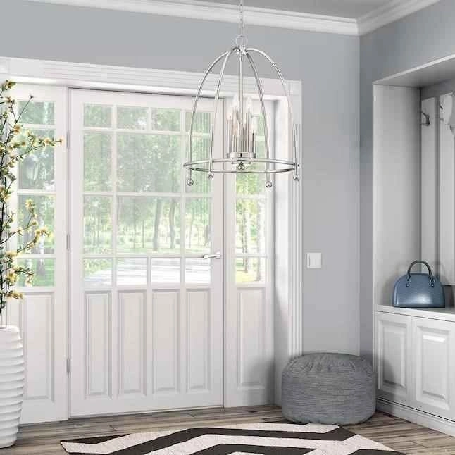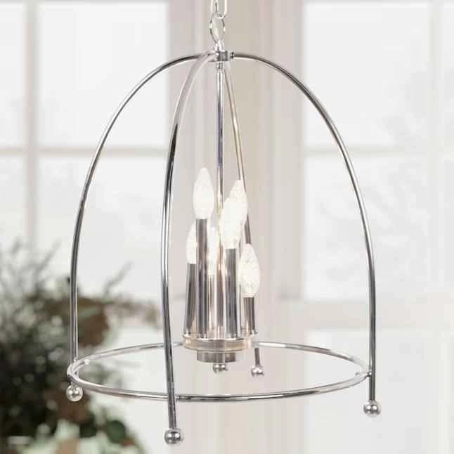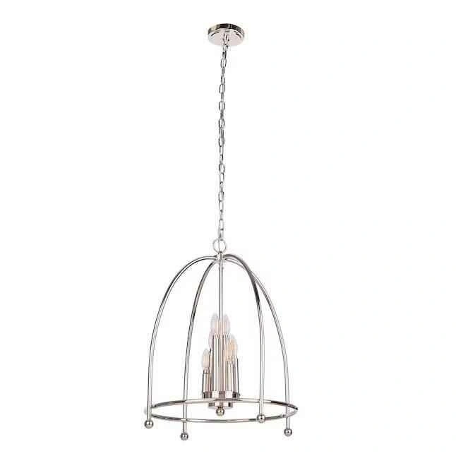 A cluster of bulbs are nestled within an open caged dome for a simple design. The clean, slim framework creates an aerie quality updating this aged candelabra style with modern elements.