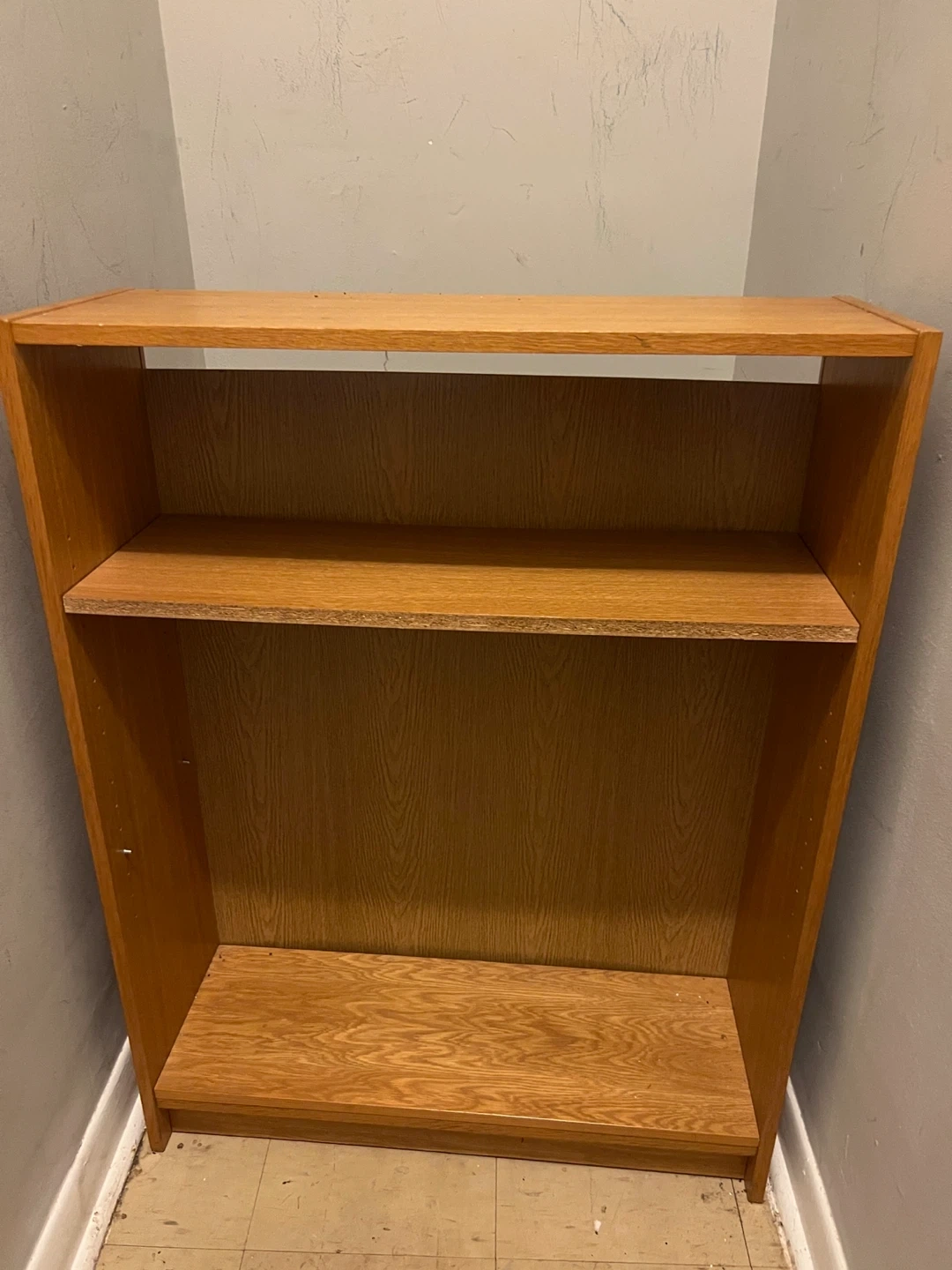 Selling a wooden bookcase. It has a nice warm tone. Great for storing books or displaying your favorite items. It has three shelves.