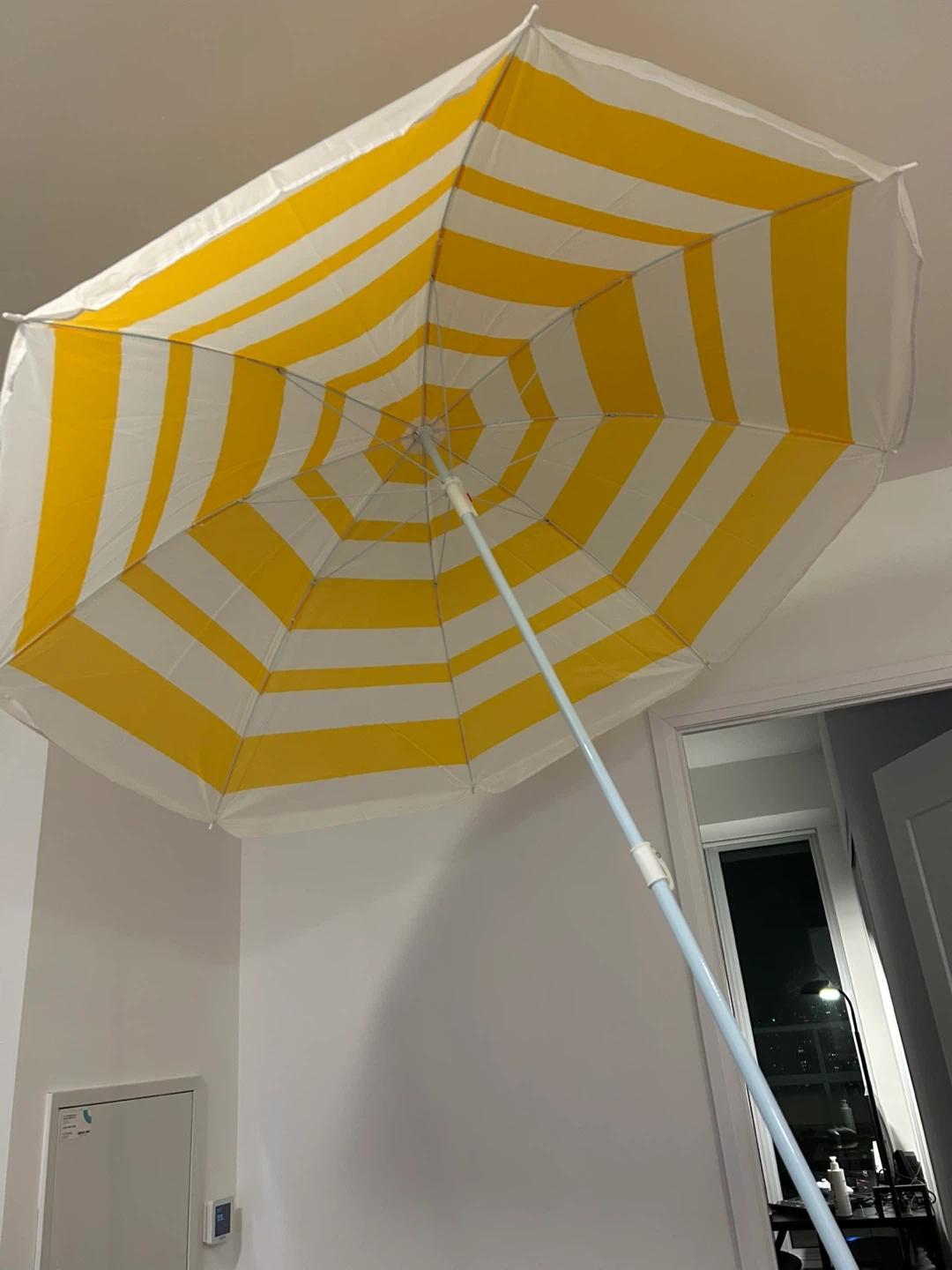 Selling a beach umbrella with a classic look! It's yellow and white striped, perfect for sunny days at the beach or park.