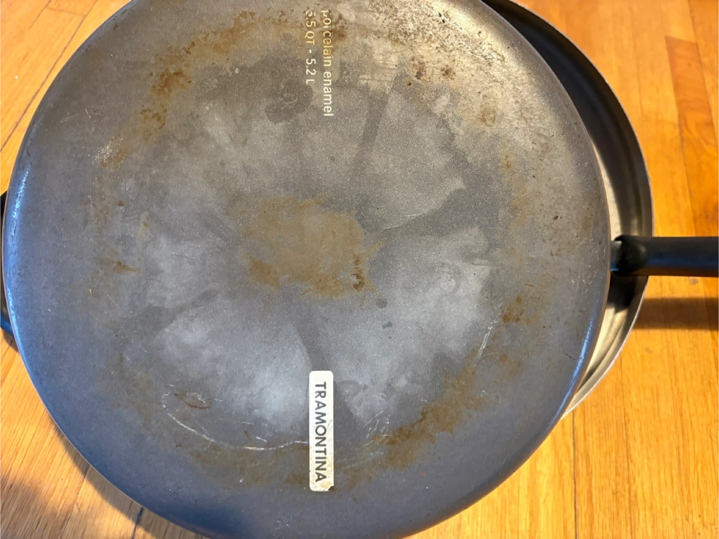 Selling a Tramontina stock pot with a porcelain enamel finish. It's a 5.5 QT (5.2 L) pot, perfect for making soups or stews. It does show signs of use.pickup at Morley trail NW