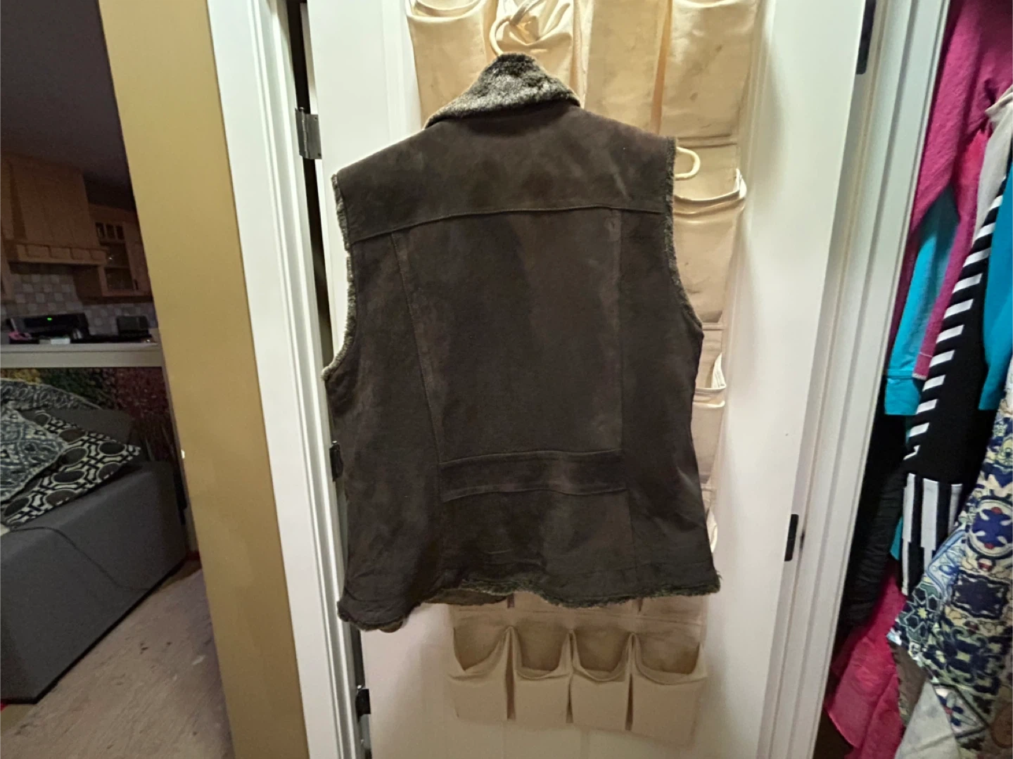 I'm selling an Eddie Bauer Seattle Suede vest in size L. It's a stylish and comfortable vest, perfect for layering! The vest features a soft, faux fur lining and a button-up front. It is in great condition and ready for a new home
