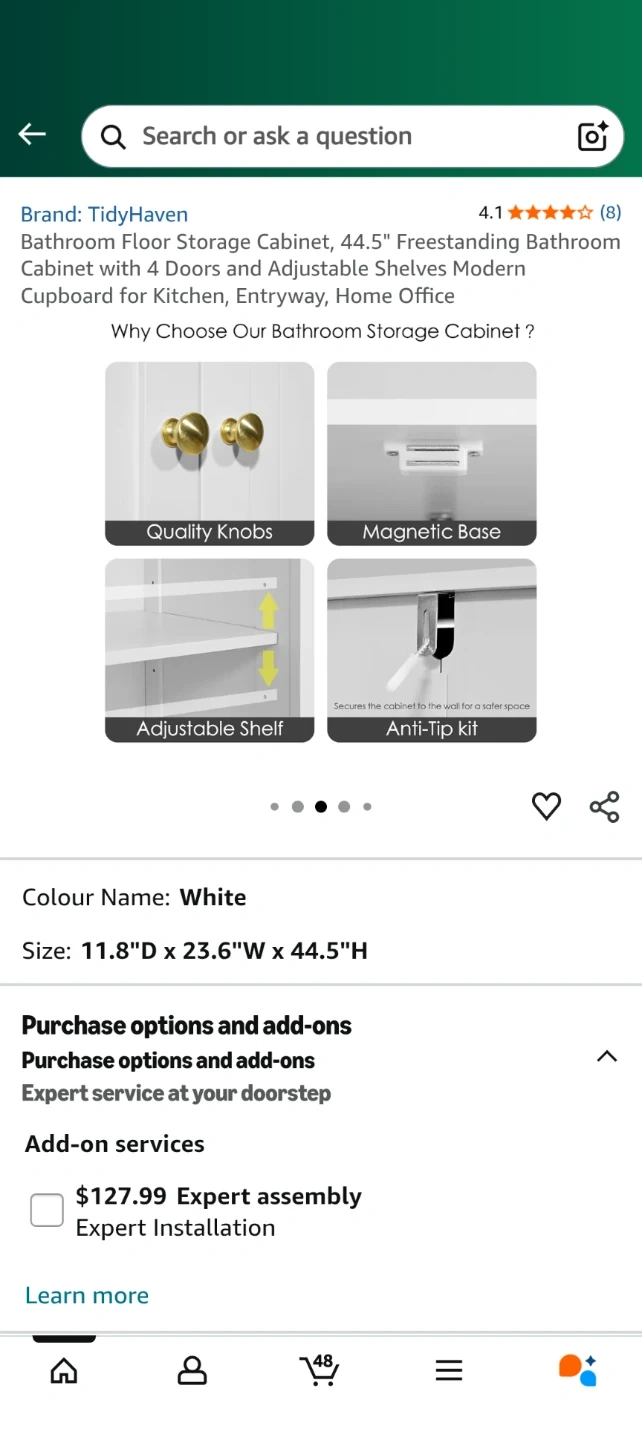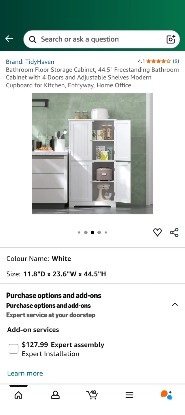 Looking to organize your bathroom? This TidyHaven floor storage cabinet is perfect! It's white and features four doors and adjustable shelves.