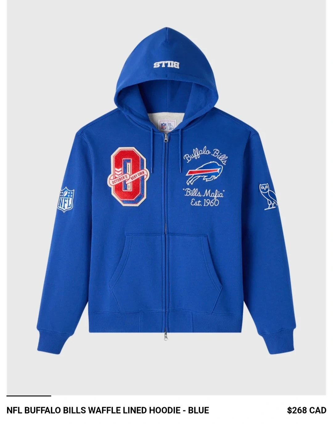 Both items feature the iconic Buffalo Bills logo and OVO owl design. The hoodie is waffle lined for extra warmth and comfort. Originally bought for $268 (hoodie) and $148 (sweatpants)