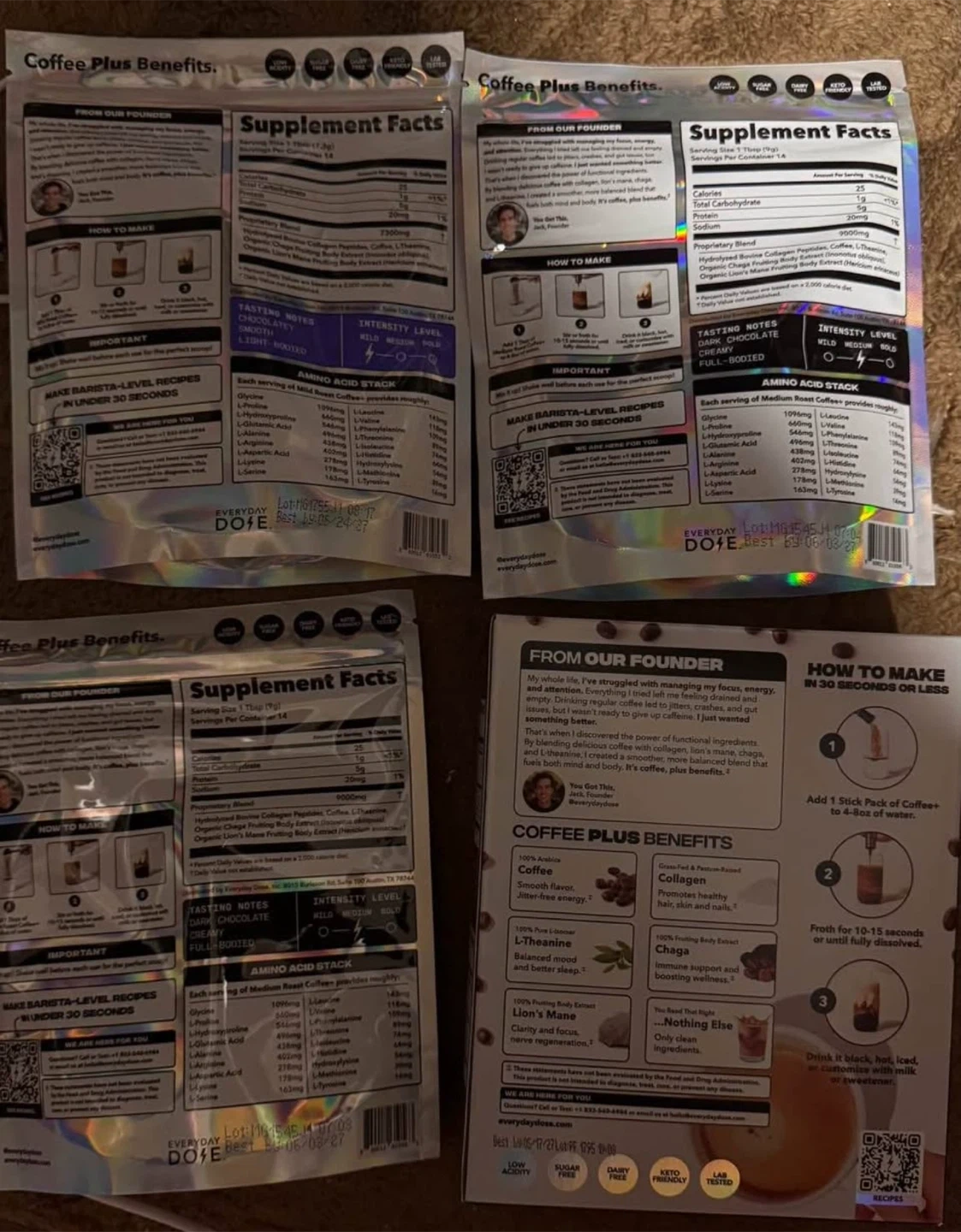 Get your daily dose of clarity and focus with this Everyday Dose Coffee+ variety pack! It includes a mix of mild and medium roast coffee blends, all infused with collagen, L-Theanine, and Chaga for gut health and no jitters. Each pack contains 100% Arabica coffee and is keto-friendly, sugar-free, and dairy-free.