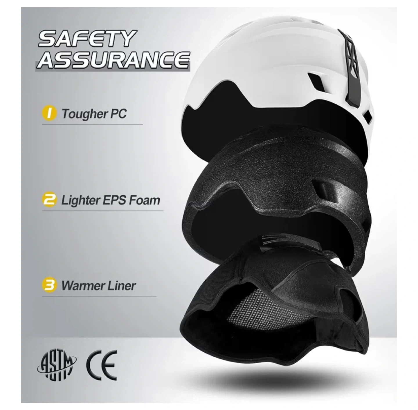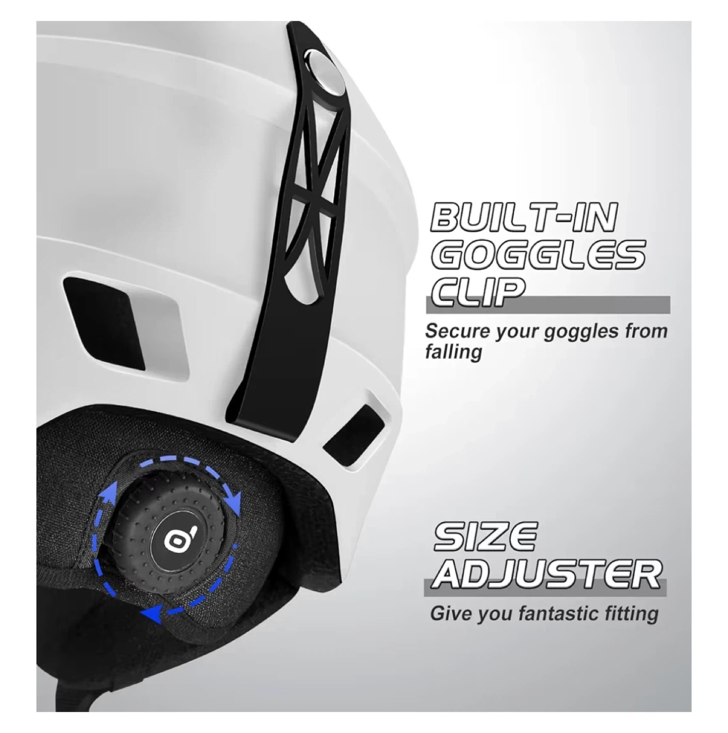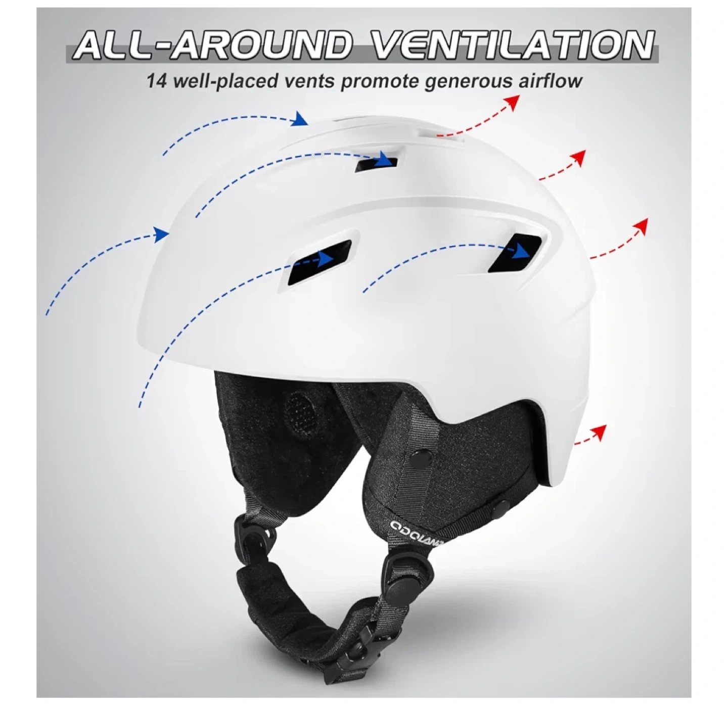 Selling a white Odoland snow ski helmet in size S (52-55cm/20.47-21.65"). It features a built-in goggles clip and a size adjuster for a fantastic fit. The helmet also has detachable ear pads and all-around ventilation with 14 well-placed vents to promote generous airflow. It is made with a tougher PC, lighter EPS foam, and a warmer liner for safety assurance.