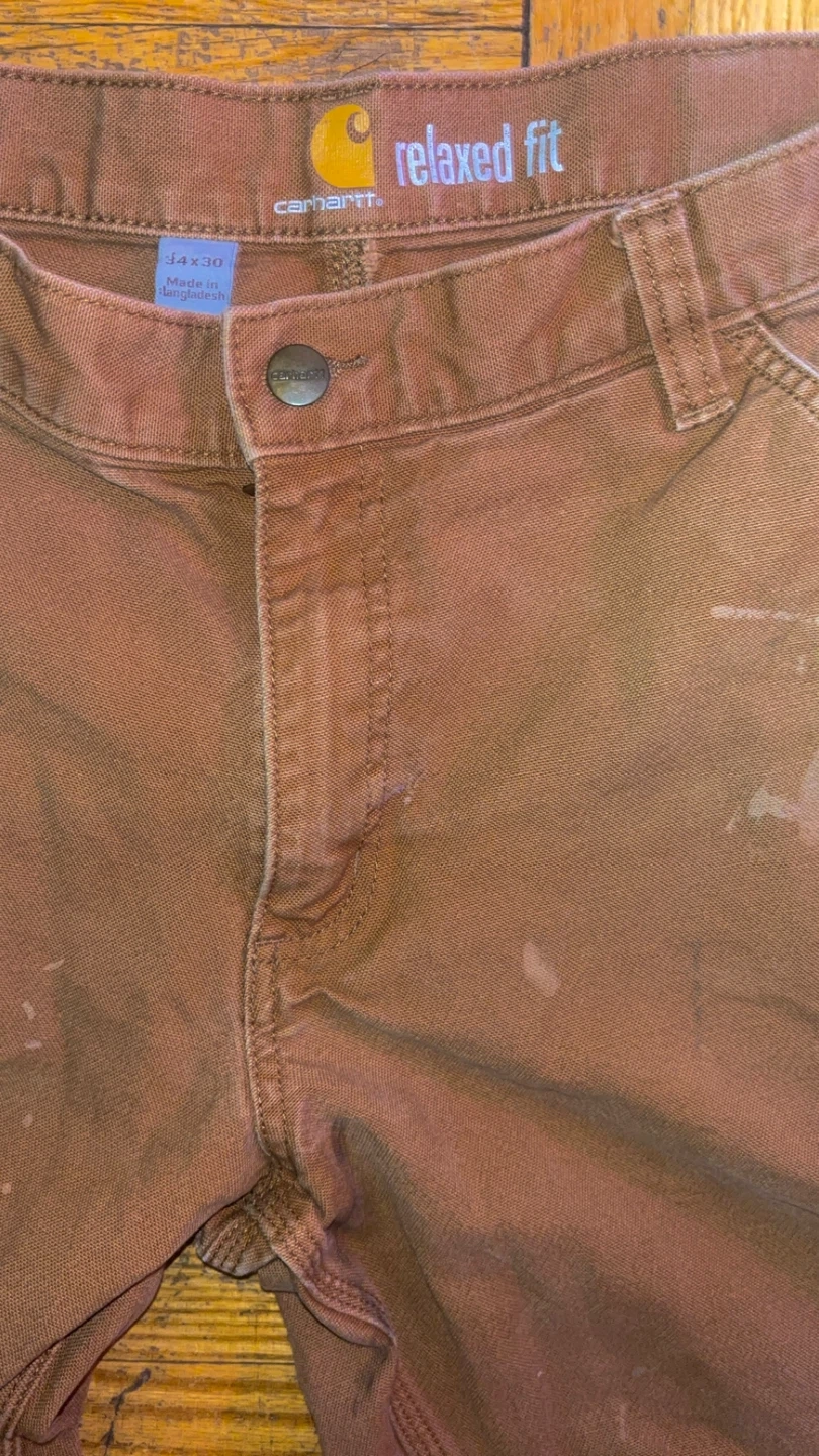 Selling a pair of Carhartt relaxed fit pants in brown. They're size 14x30 and have a comfortable, relaxed fit. There are some signs of wear, as pictured, but they're still in good condition for work or casual wear