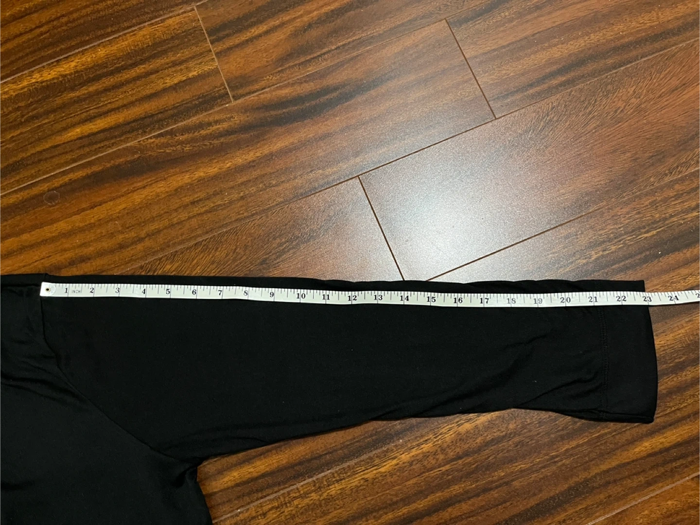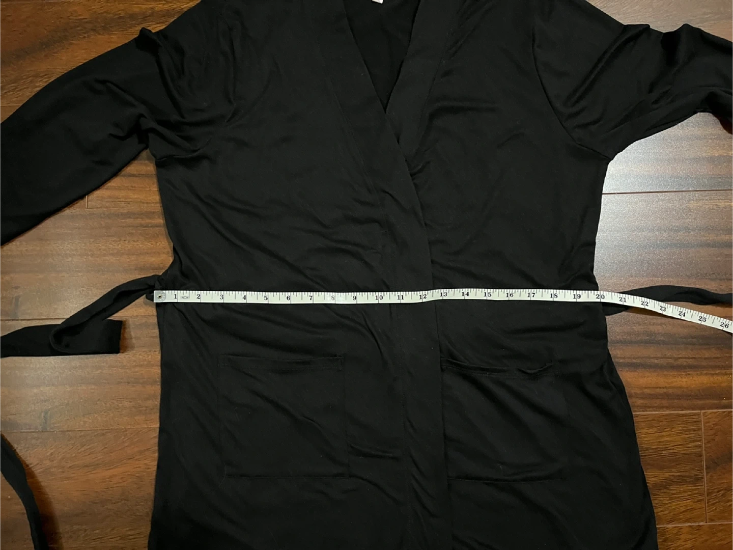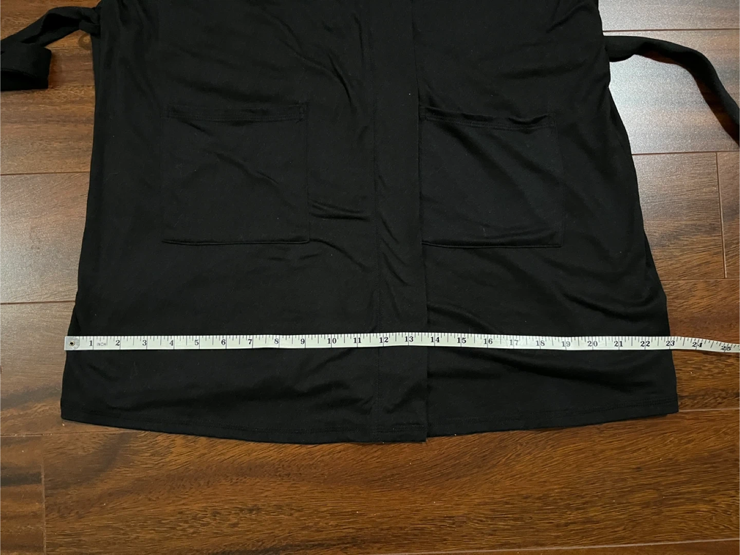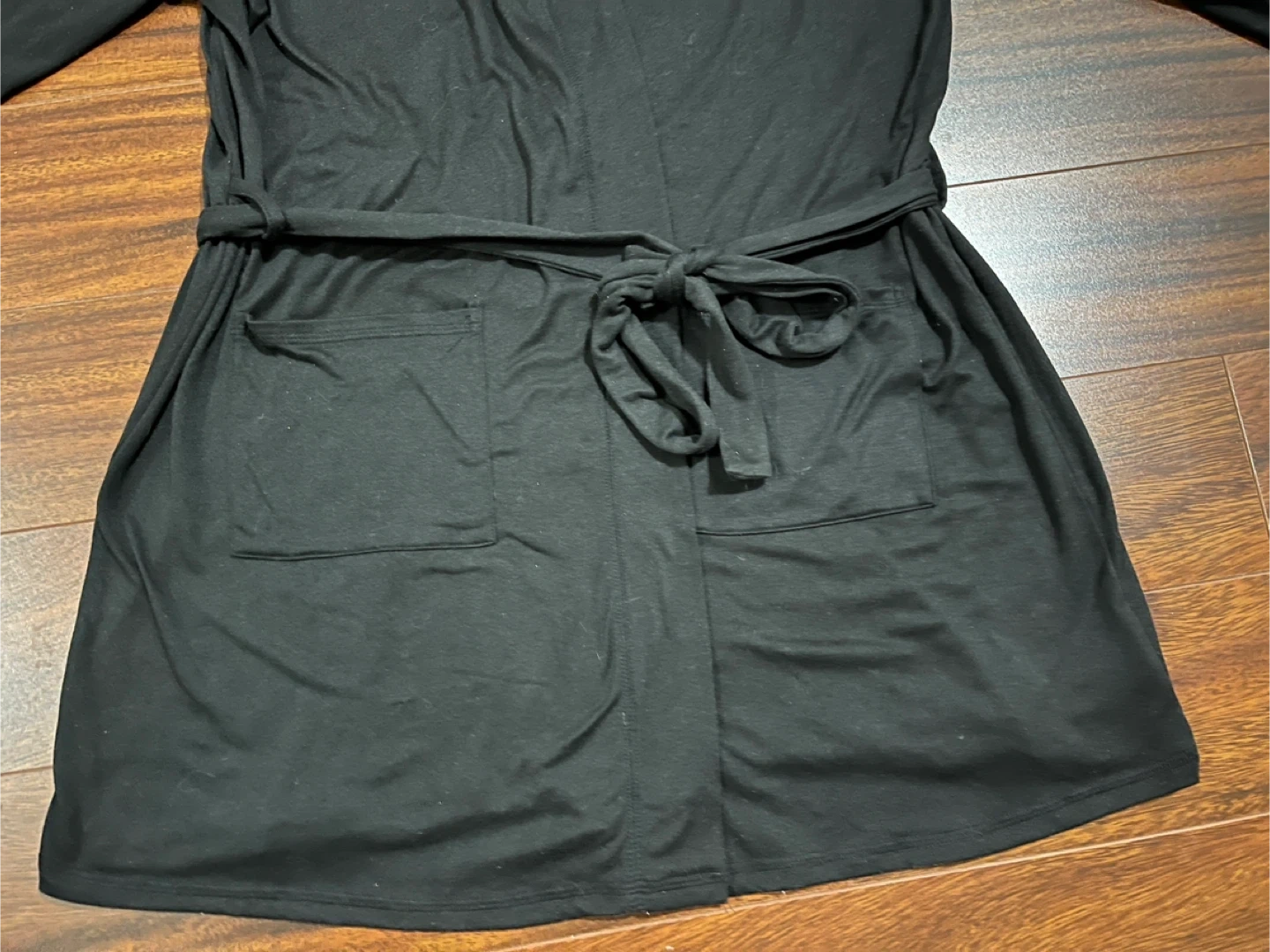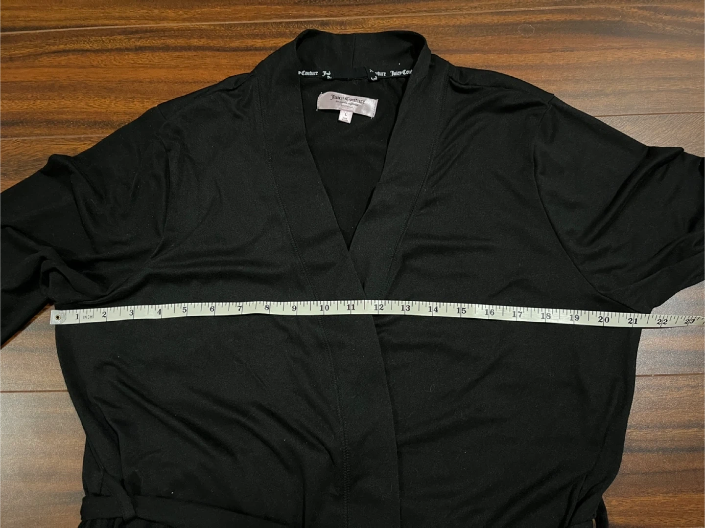 Juicy Couture women’s large black jersey knit wrap bathrobe with inner ties and outer belt. Two front pockets and long sleeves. Large ombre Juicy logo on the back in pink fading to light violet. Stretchy adjustable fit.
