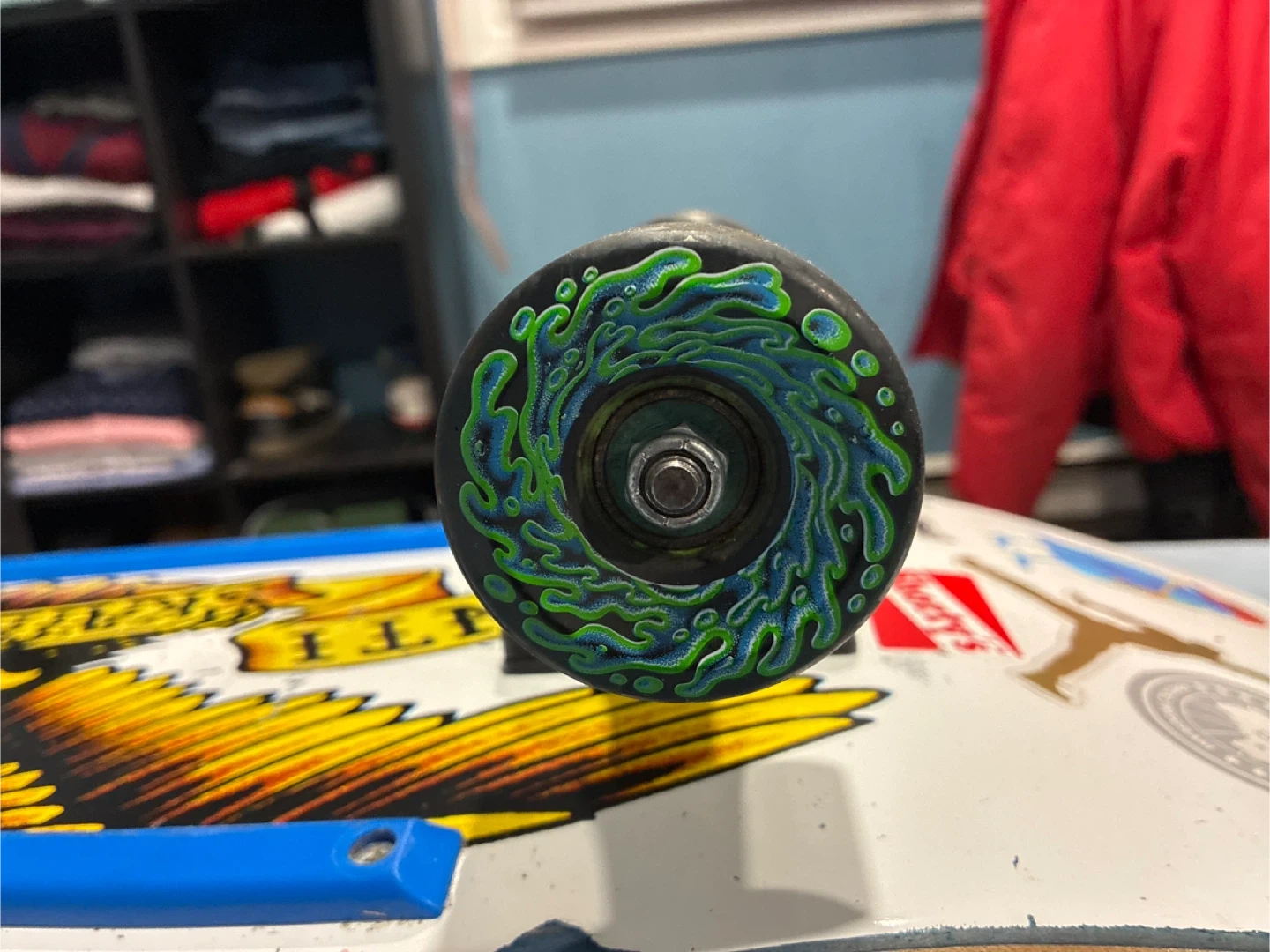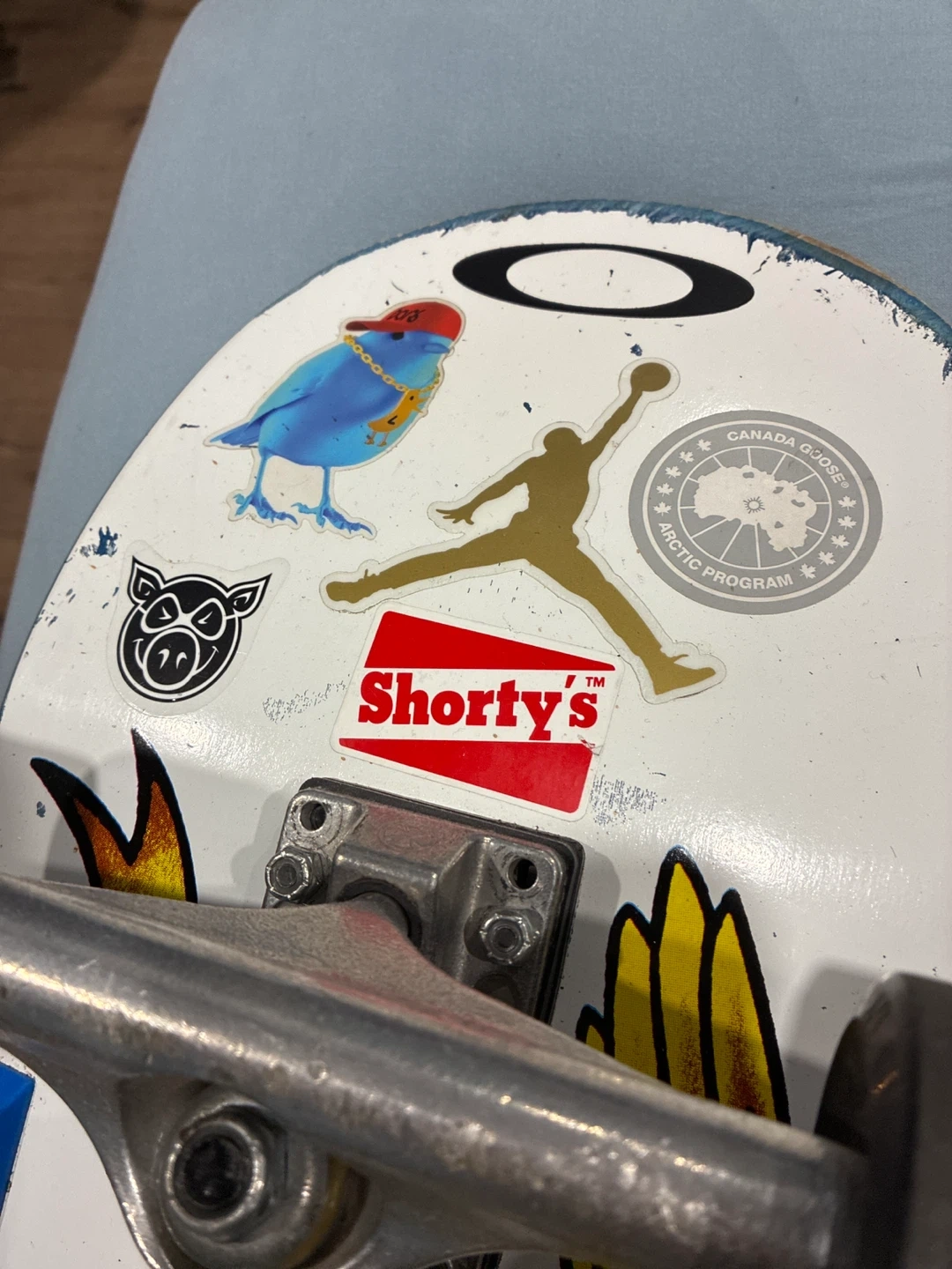 White antihero skateboard deck 8.75” and 159 Independent trucks with riser pads. It also has Shorty's hardware and PIG rails, bones red big ball bearings and Slime ball wheels 60mm