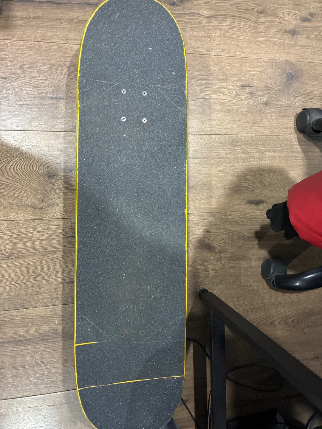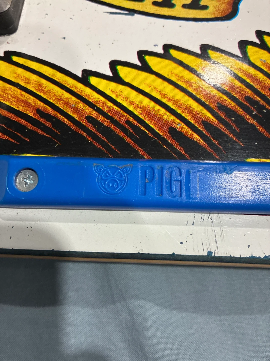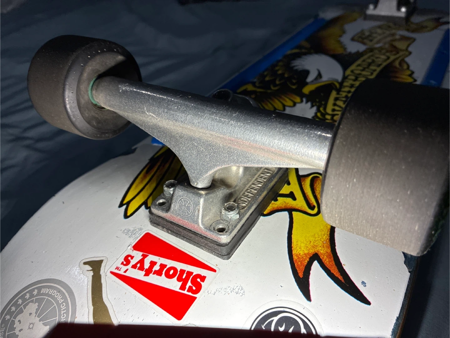 White antihero skateboard deck 8.75” and 159 Independent trucks with riser pads. It also has Shorty's hardware and PIG rails, bones red big ball bearings and Slime ball wheels 60mm