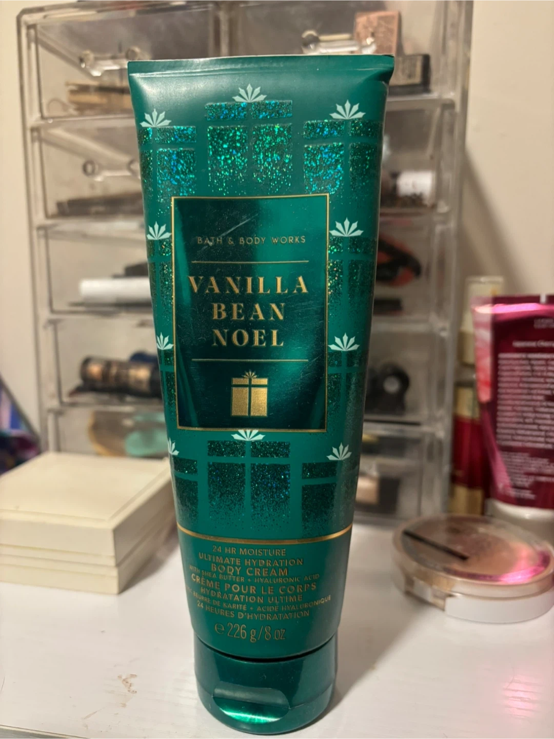 Selling a Bath & Body Works Vanilla Bean Noel body cream! It's a 24 hr moisture ultimate hydration body cream with shea butter and hyaluronic acid. The size is 226 g / 8 oz