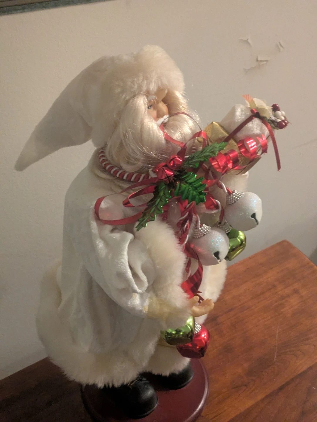 This is a charming Santa Claus figurine, perfect for adding a festive touch to your holiday decor. It features a white outfit with faux fur trim and holds a bundle of gifts and ornaments. It's in great condition and ready to bring some Christmas cheer to your home