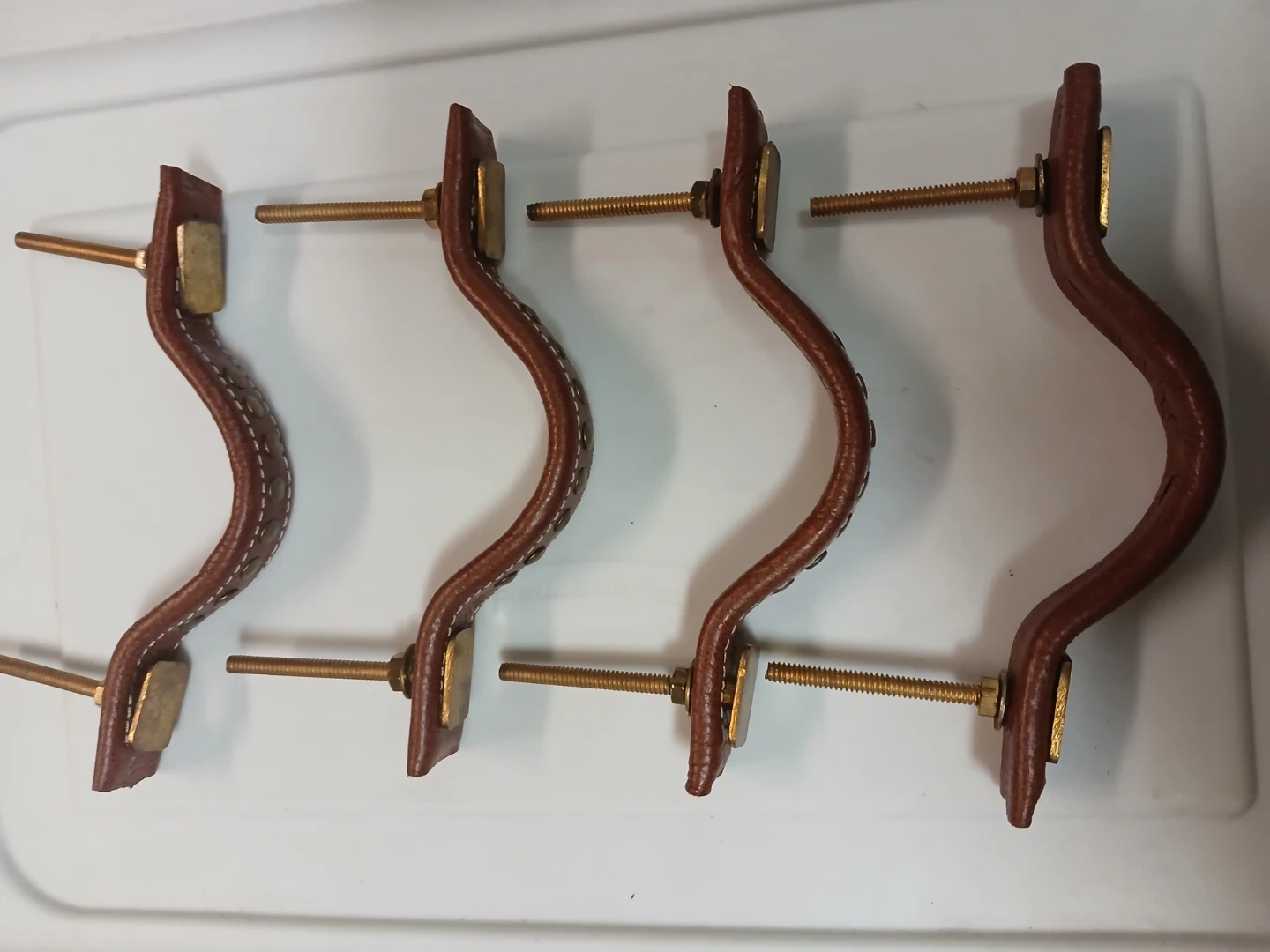 Selling a set of 4 leather cabinet or drawer pulls. They're in great shape and would add a nice touch to any furniture piece! The pulls are brown leather with brass accents and stitching details. They measure approximately 4 inches in length.