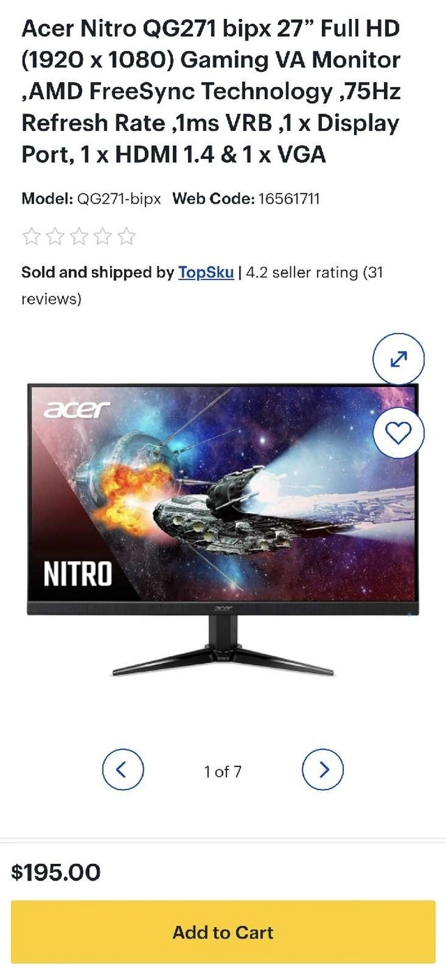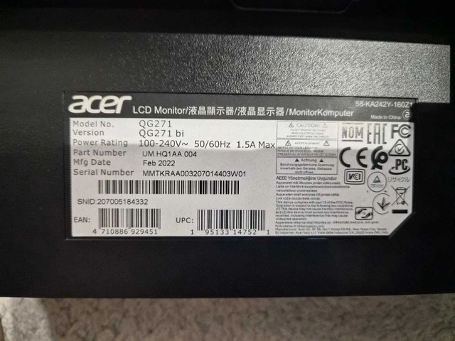 Acer gaming monitor in great condition. I no longer need it, but it’s been kept in excellent condition. Note: I don’t have the original box. The monitor works perfectly. I mainly used it as a second screen while studying, so it hasn’t been heavily used for gaming. Enjoy a comfortable viewing experience with Flicker-less, Low Dimming, and ComfyView technology. Its slim, space-saving design also makes it easy to set up multiple monitors side by side for a seamless, wide display. Perfect for gaming, studying, work-from-home, or everyday use. Let me know if you're interested!