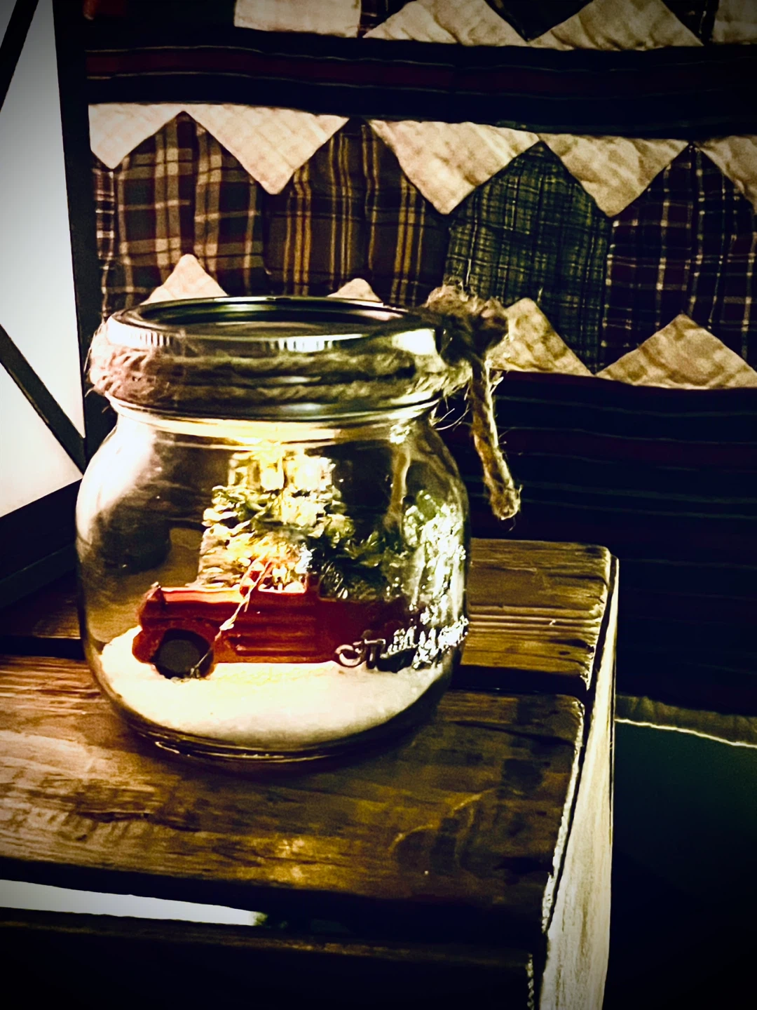 This charming snow globe jar features a red truck and a miniature Christmas tree inside! It's a perfect little decoration to add some holiday cheer to any space