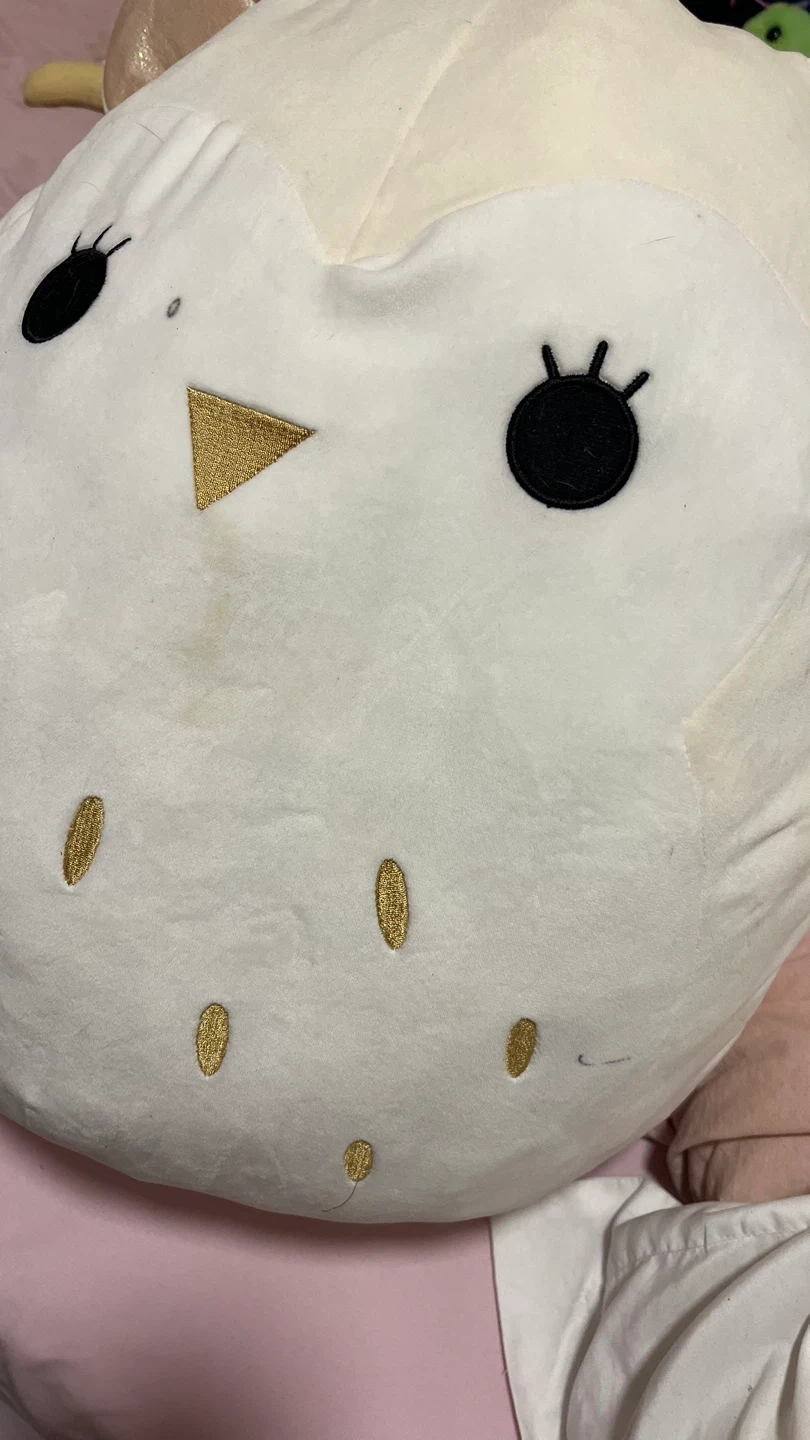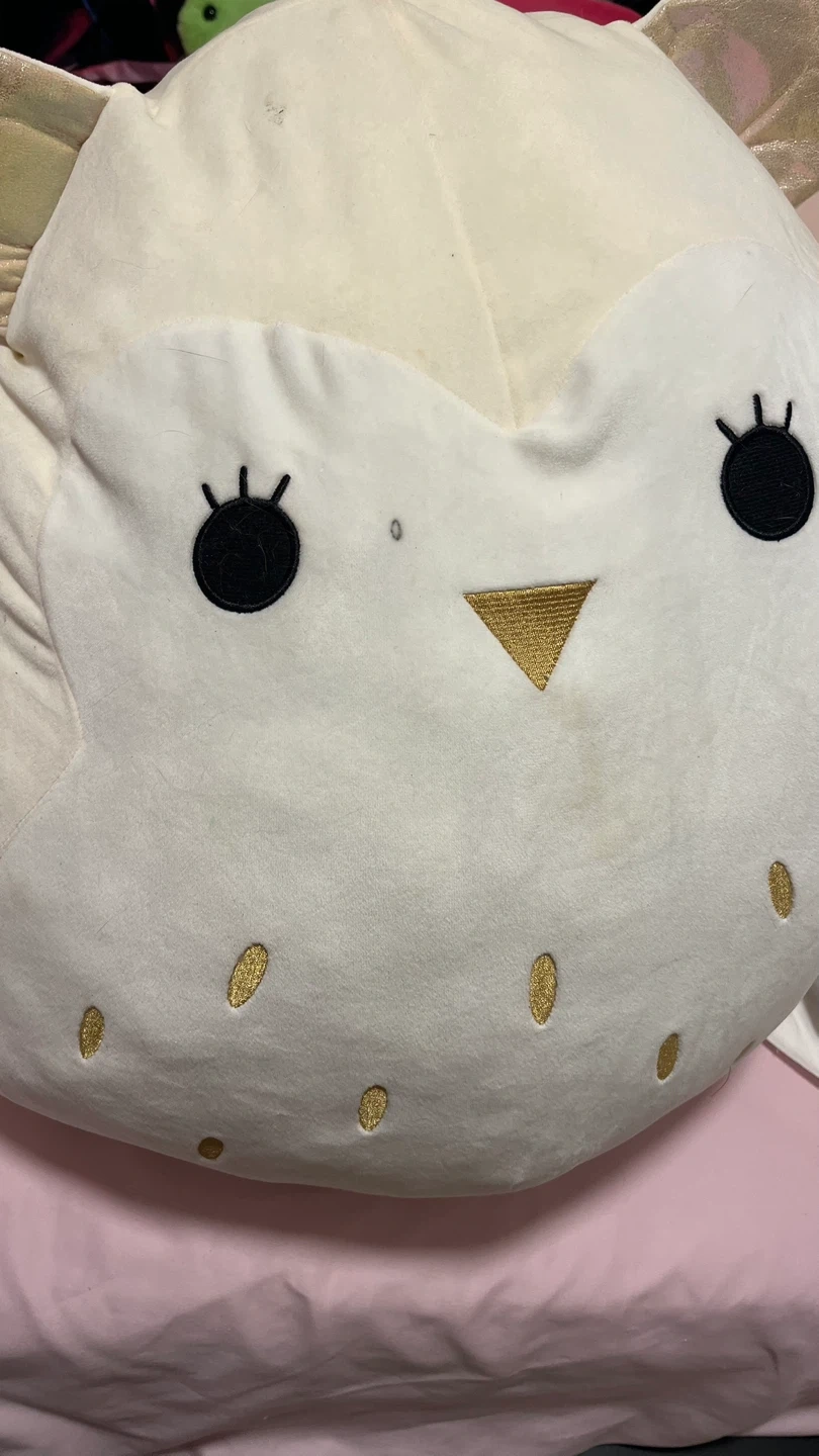 Here's a cute owl Squishmallows plush! It's white with gold accents. There are a few small marks on the front.