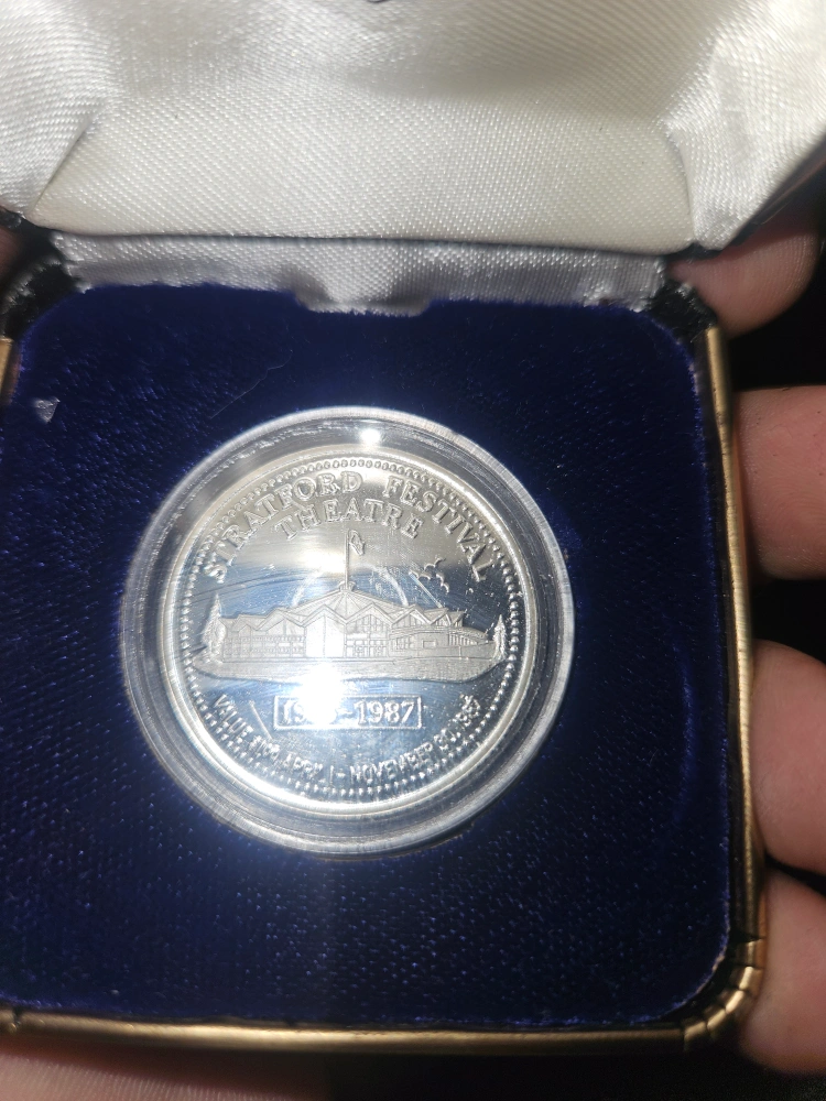 Selling a commemorative coin from the Stratford Theatre Festival, crafted from 999 fine silver. It celebrates the years 1953-1987. It comes in its original box, making it a great collectible for theatre enthusiasts
