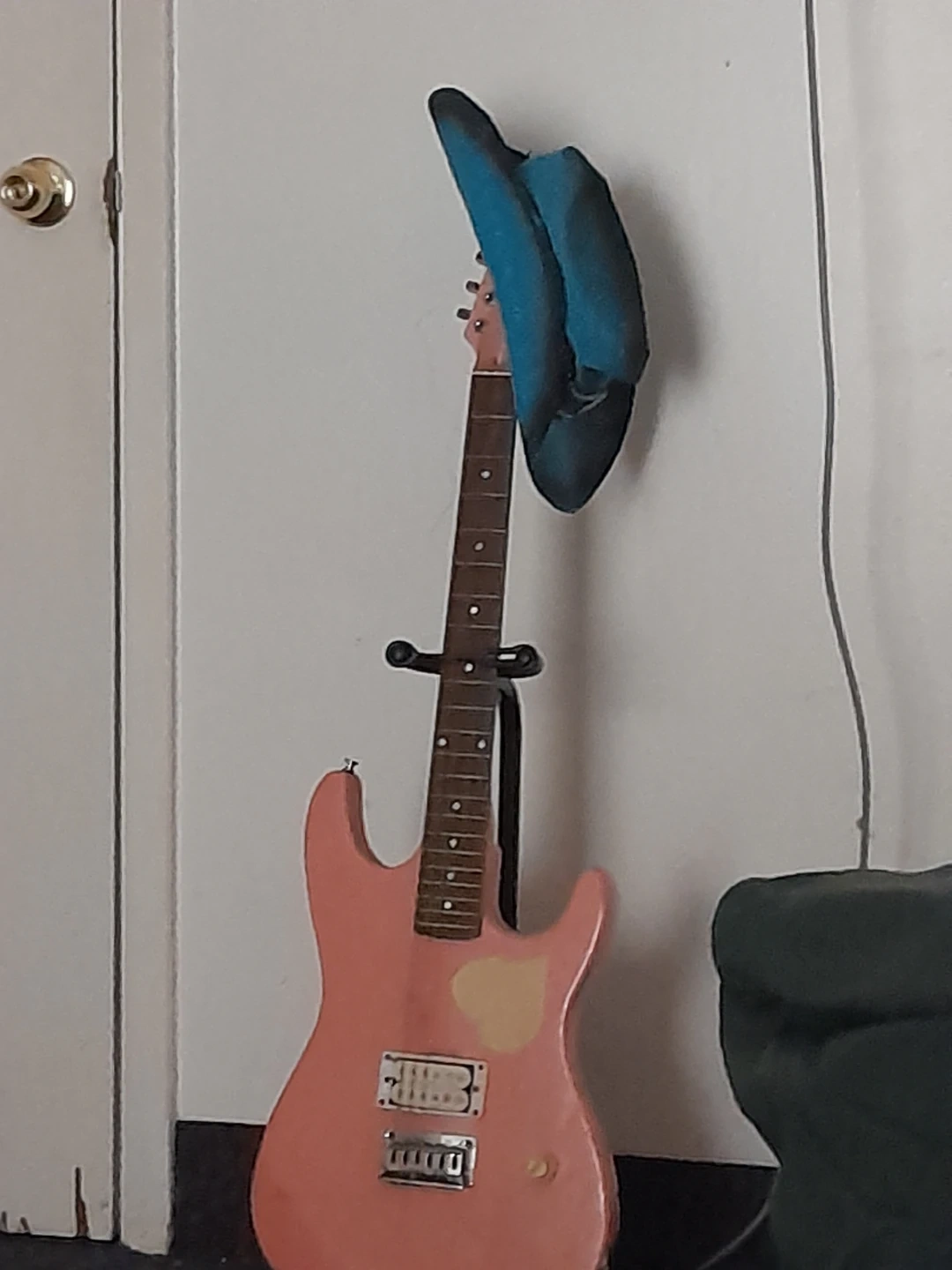 Selling a pink electric guitar. It has a heart design on the body. Perfect for someone looking to start playing or add a unique piece to their collection! Good condition just needs strings