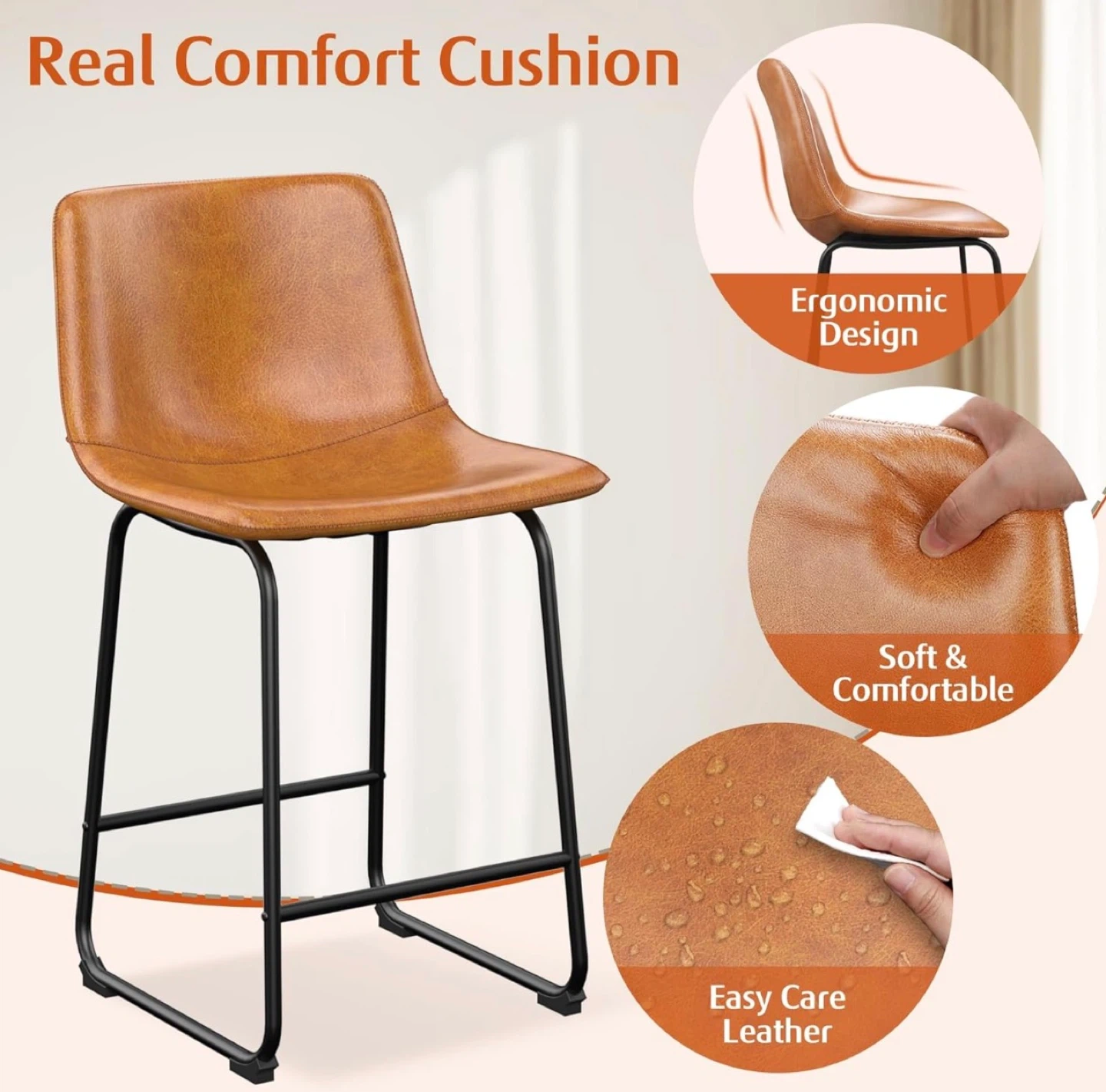 Selling a comfortable tan faux leather bar stool. It has a 26" seat height, perfect for kitchen islands or bars. The stool features an ergonomic design with a real comfort cushion and easy-care leather. It also has relaxing pedals and a non-slip protector for added stability and convenience