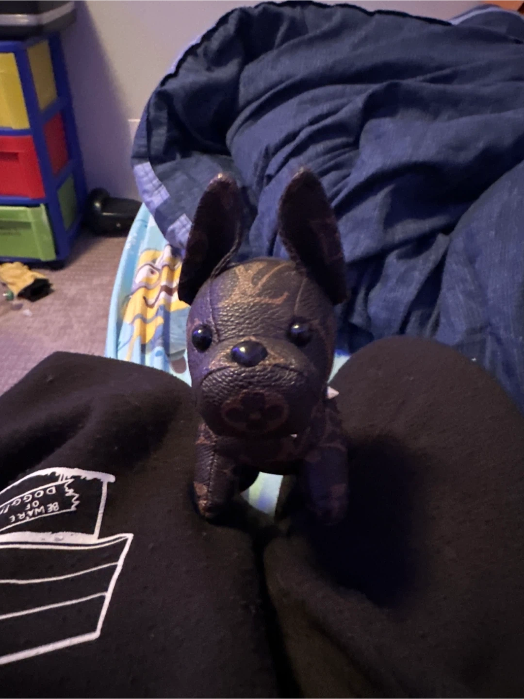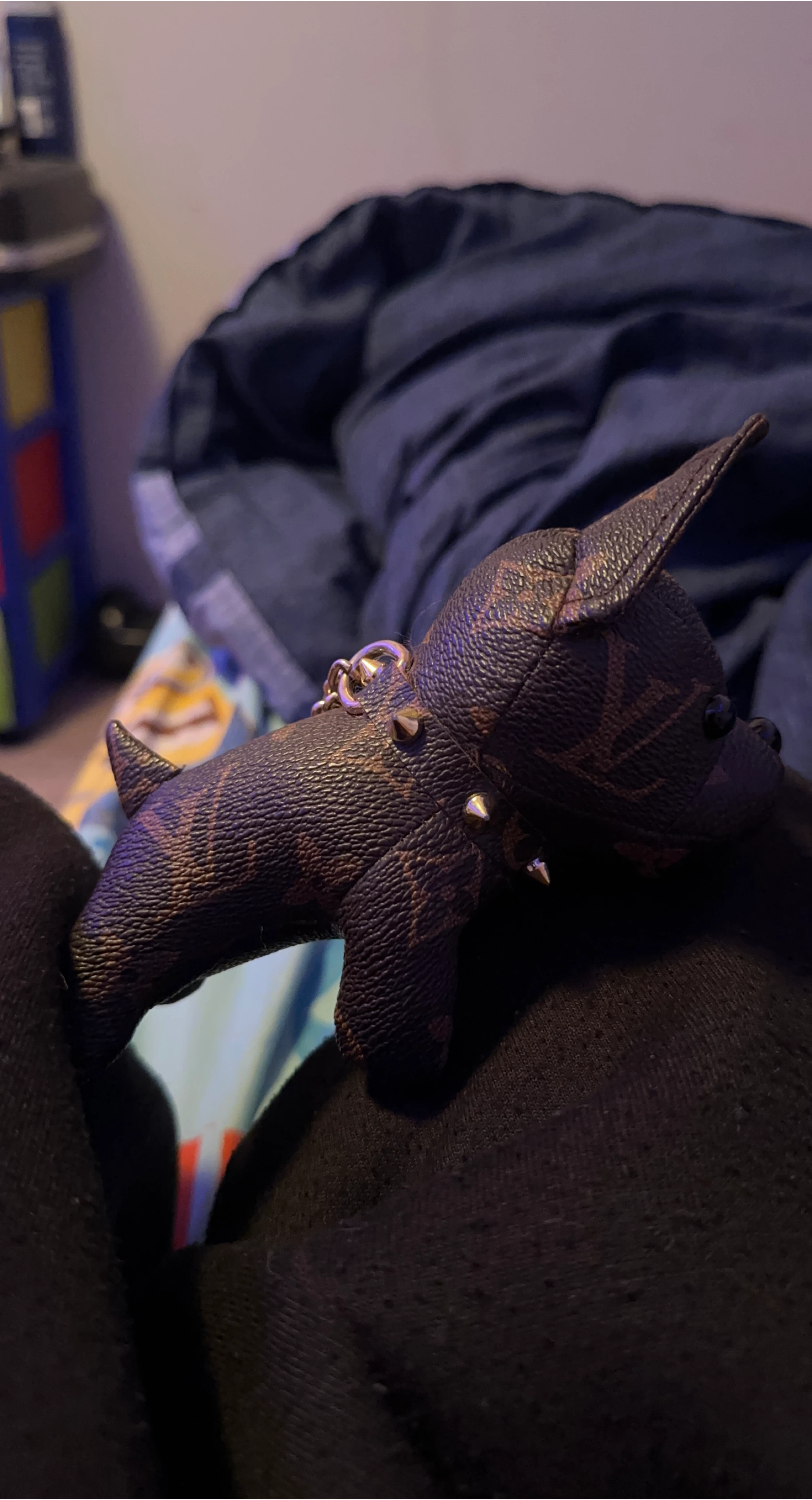 This is a Louis Vuitton dog bag charm and key chain. It's in great condition and has a silver chain with a clasp. It features the classic LV monogram pattern.