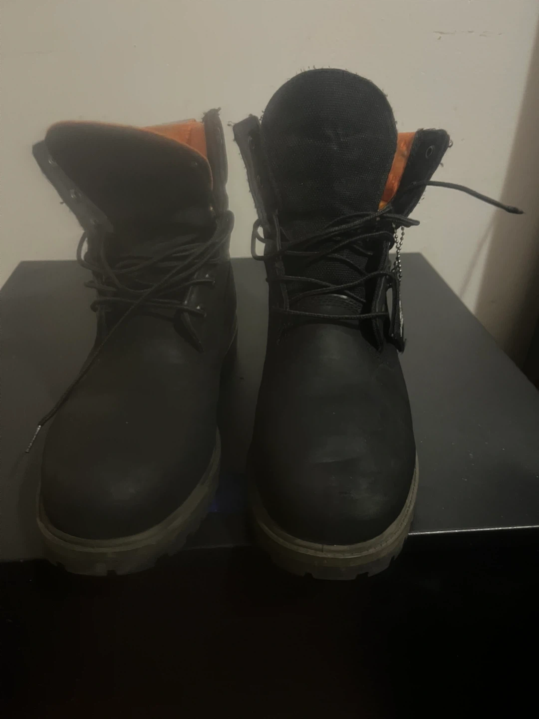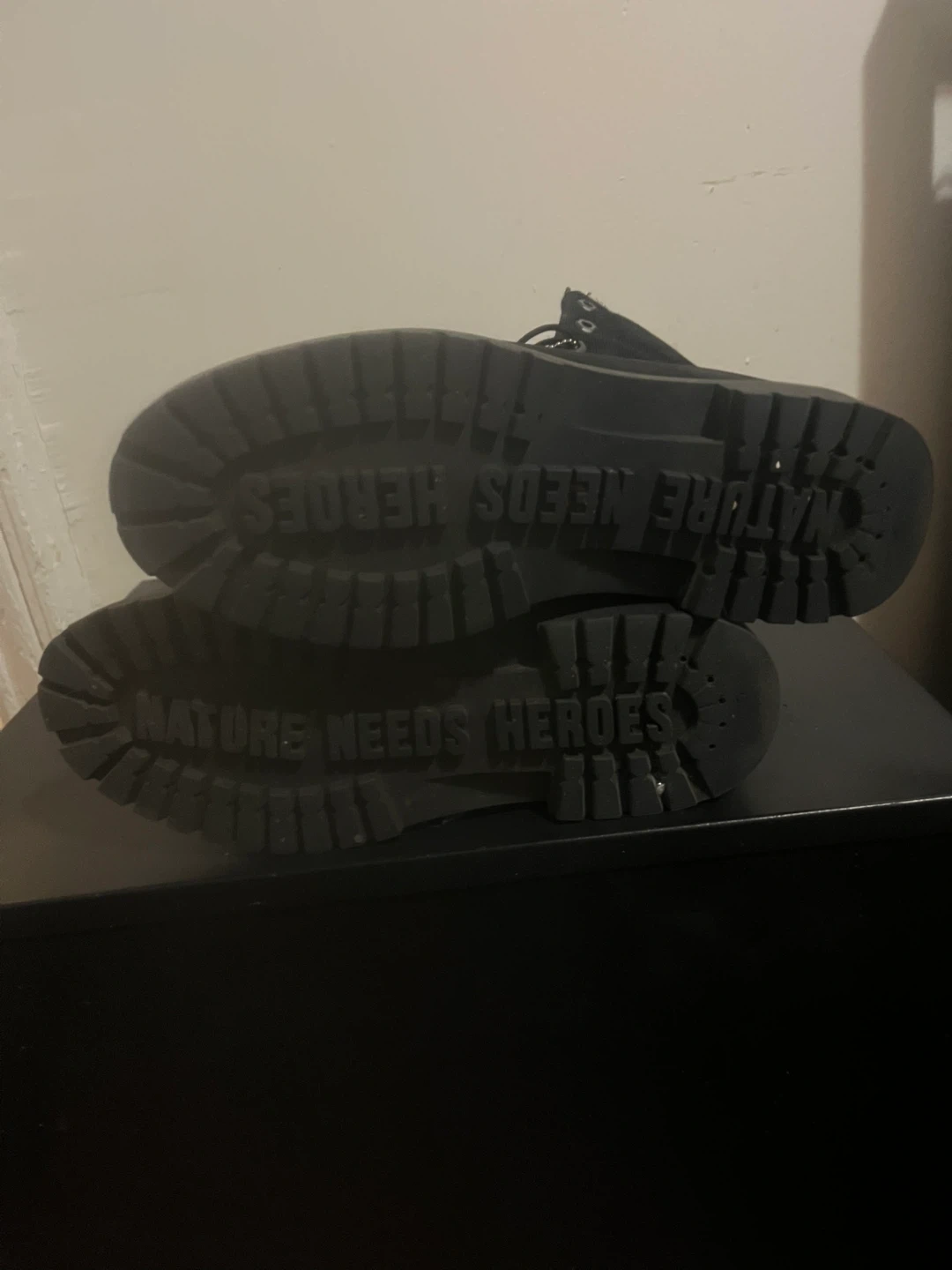 Selling a pair of Timberland boots from the Nature Needs Heroes line. They are black and have the phrase "Nature Needs Heroes" printed on them. They show some signs of wear.
